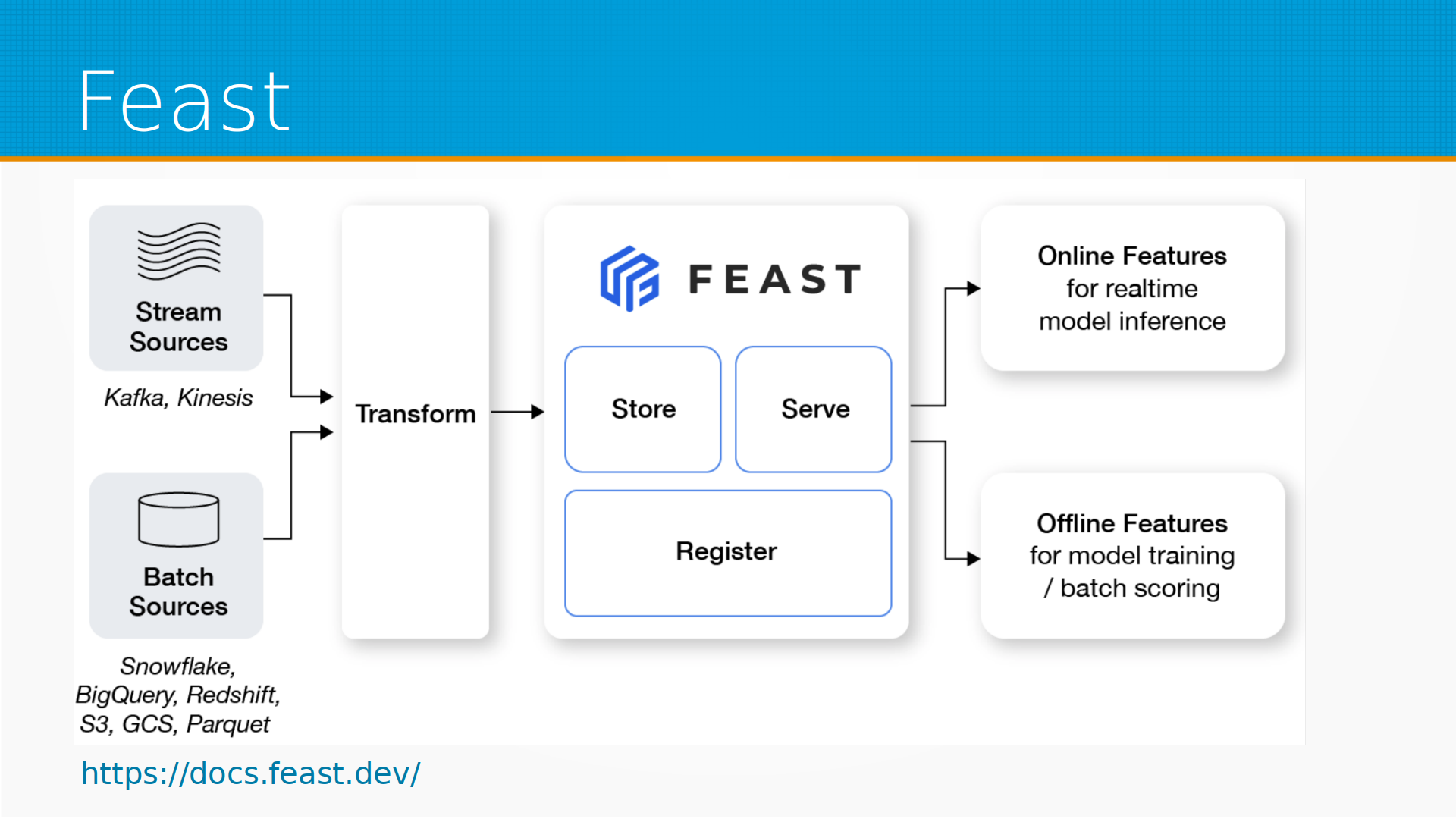 Самый, наверное, известный фич-стор – это Feast. Собственно, они, наверное, родоначальники этого термина. Они позволяют хранить описание признаков, хранить сами насчитанные признаки, а непосредственно расчетом данных, расчетом признаков Feast не занимается. Предполагается, что у вас есть какие-то источники данных, потоковые или по расписанию насчитанные, есть какая-то инфраструктура, которая выполняет подготовку данных, а Feast уже хранит насчитанные данные в каком-нибудь хранилище, с которым он умеет работать, и отдает их в систему инференса, и позволяет обеспечить доступ к данным для обучения моделей, для бэк-тестов и так далее и тому подобное, то есть онлайн и оффлайн фич-стор.
