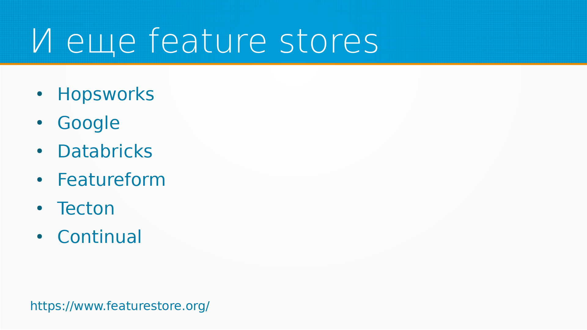 Такие же фич-сторы есть у Google в их Vertex AI и вообще у любого крупного поставщика вычислений. То есть есть в Databricks, есть в Tecton, есть в Hopsworks поверх Hadoop. И тут хорошо посмотреть на сайте featurestore.org, сравнить их по этой ссылке, какие у них есть особенности, и подобрать тот, который лучше укладывается в ваш набор инструментов.