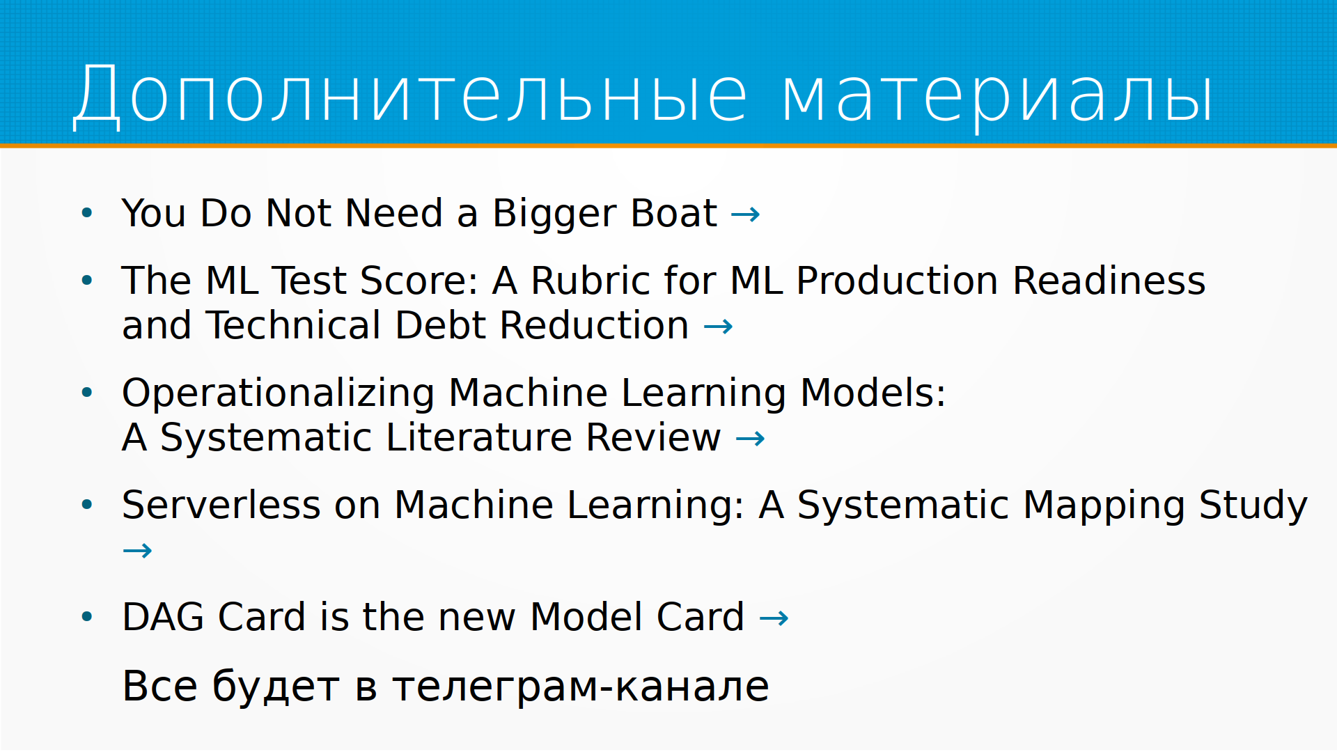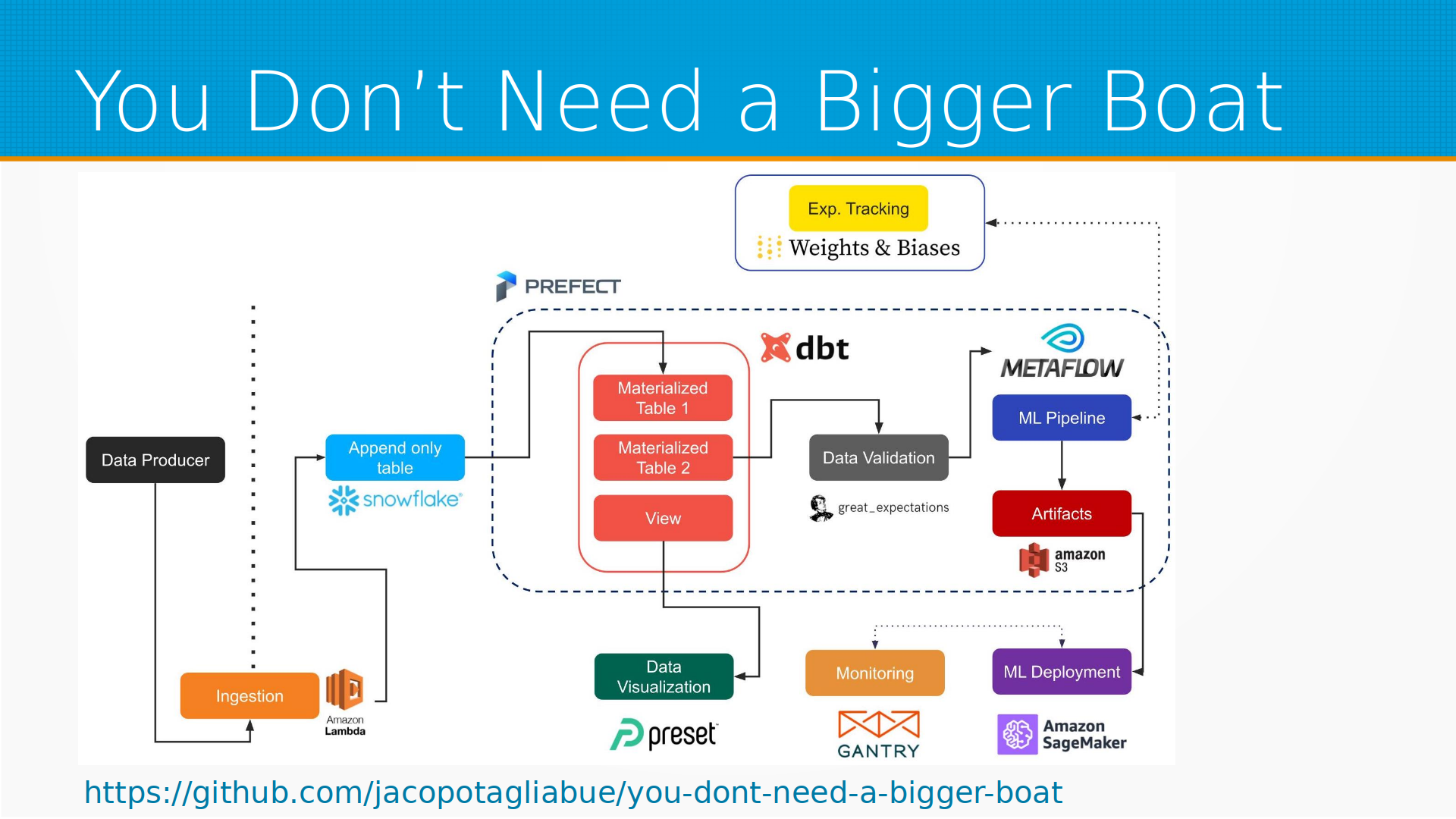 Есть хорошая статья и референсная архитектура, где мы обходимся без своих серверов и все serverless считаем. То есть есть некоторые источники данных, которые выдают нам данные в наш брокер данных, откуда мы в Amazon Lambda их обрабатываем, и складываем в Snowflake, это таблицы, в которых мы не обновляем данные, а только добавляем их, только дописываем в конец. Из этого с помощью, например, Prefect мы готовим некоторое материализованное представление, то есть таблицу с последними самыми свежими данными по каждому объекту. Они проходят какую-нибудь валидацию с помощью, например, GreatExpectations, преобразуются с помощью DBT, мы их визуализируем с помощью Preset. Дальше с помощью Metaflow, например, мы serverless обучаем модели, сохраняем артефакты в S3, деплоим в Amazon SageMaker, мониторим с помощью Gentry — я бы посоветовал Evidently AI, но в общем в этой статье используют Gentry. И все это не требует вам покупки серверов, все это вы можете сделать serverless.