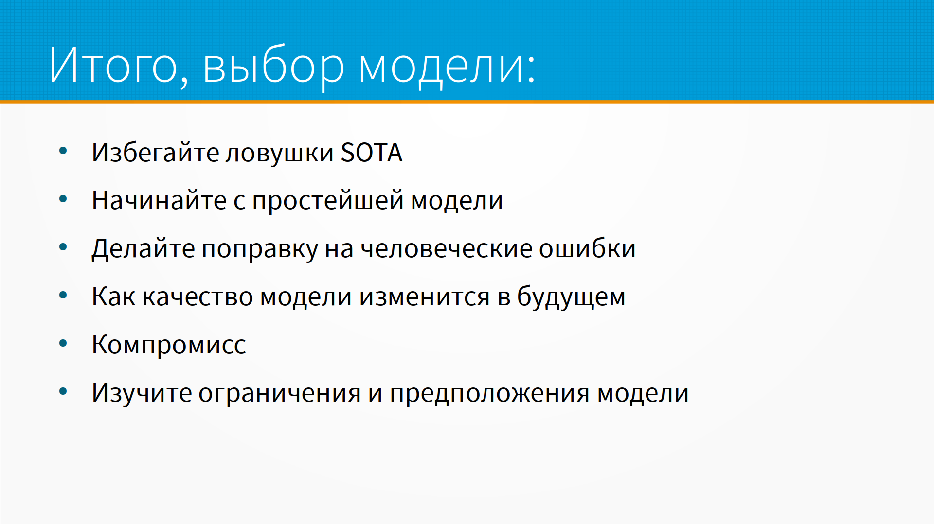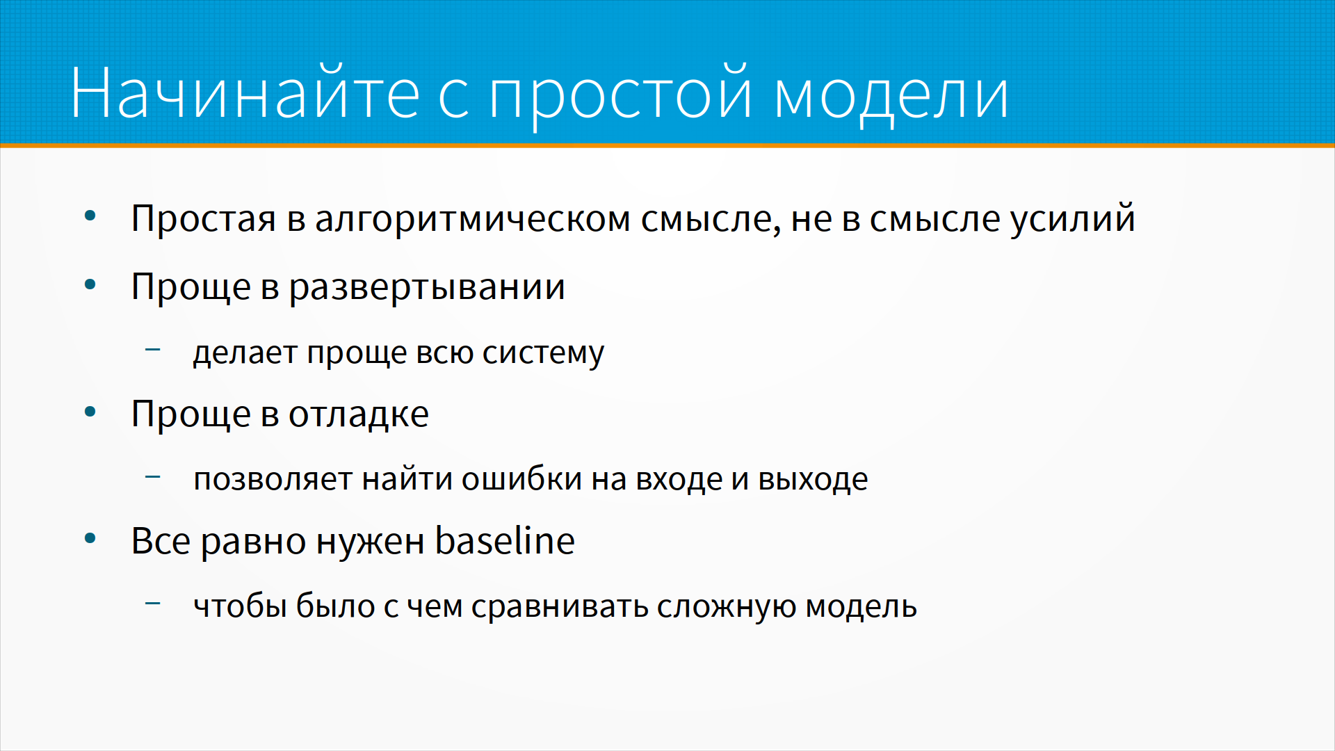 На самом-то деле ошибки на входе и выходе, то есть мусор, который вам приходит, и проблемы с применением вашего предсказания, которое вы уже сделали, обычно являются большими проблемами, чем качество вашей модели. То есть вы можете построить прекрасную модель, но пользователь передаст вам какие-нибудь неполные или странные данные или не сможет пользоваться тем предиктом, который вы сделали по его техническому заданию. В общем, сделайте как можно раньше как можно более простую модель. И все равно вам понадобится baseline, чтобы сравнивать ваши сложные модели. Вот это и будет ваша простая модель baseline.