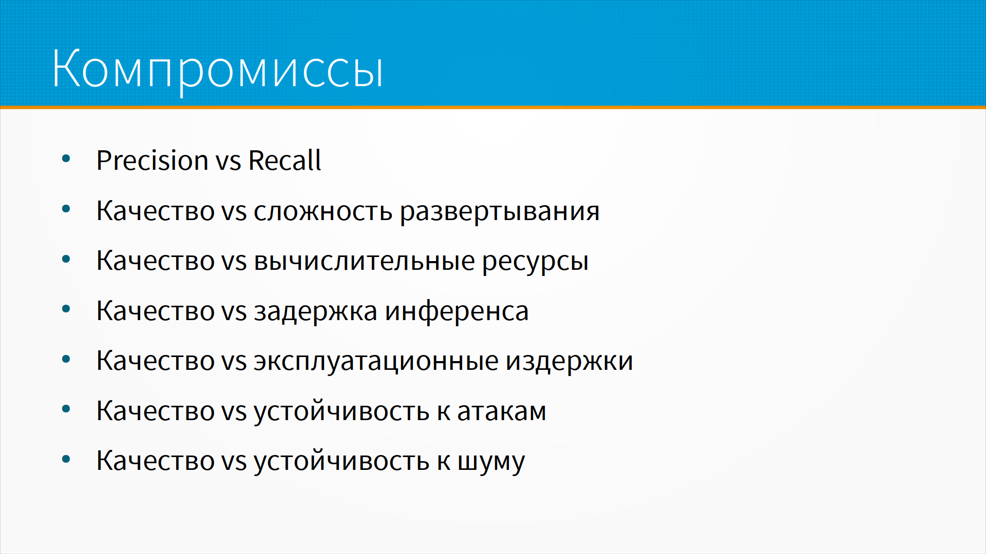 Следующий компромисс, с которым все время приходится работать - это качество против сложности развертывания, качество работы модели. Обычный вариант - это выбор между нейронками, градиентным бустингом и, например, логрегом, логистической регрессией. Если, конечно, такой выбор стоит, то логистическая регрессия деплоится очень просто, деревья и градиентные бустинги тоже деплоятся просто, в с нейронными сетями приходится повозиться.