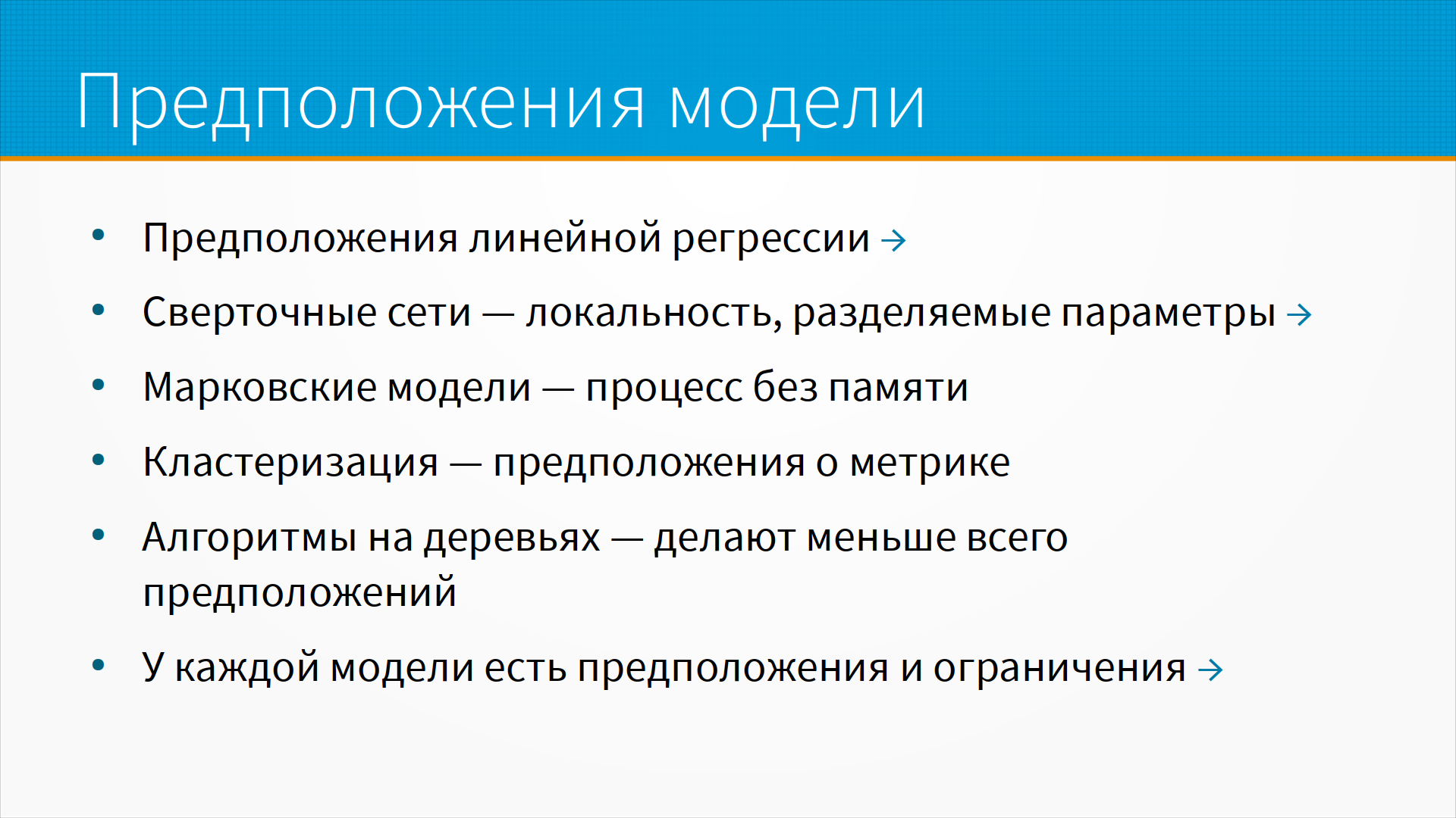 делает какие-то предположения. Например, линейная регрессия. Ее предположения