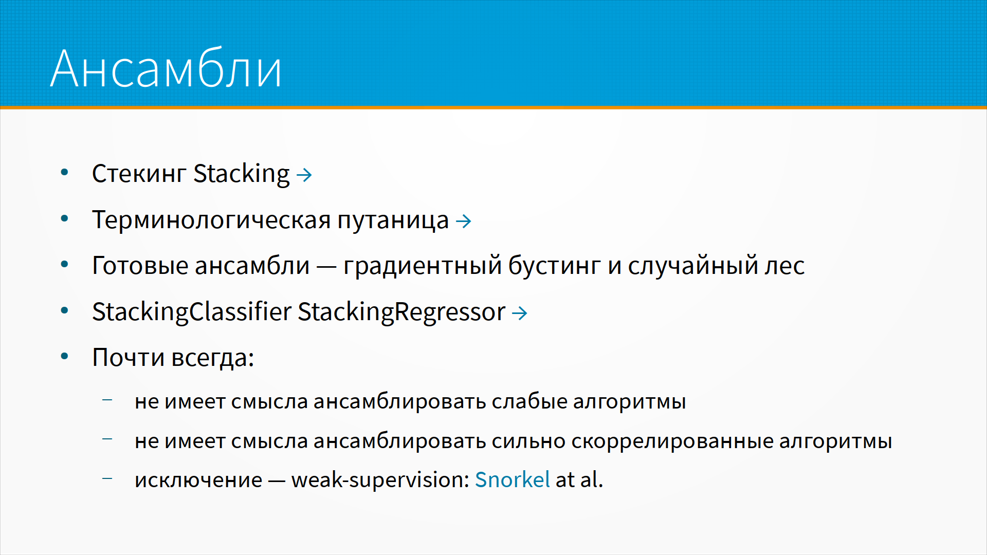 ансамбль и качество их примерно равное. Ну и про weak supervision в Snorkel я уже