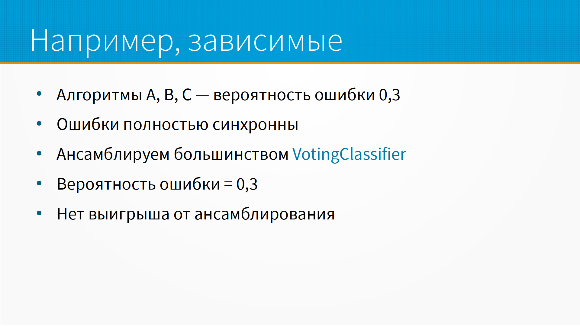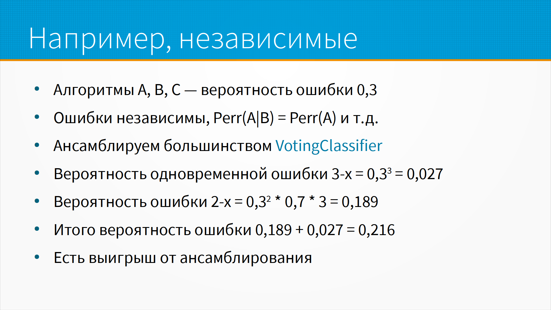 ансамблируем большинством, voting classifier, и вероятность ошибки у нас остается