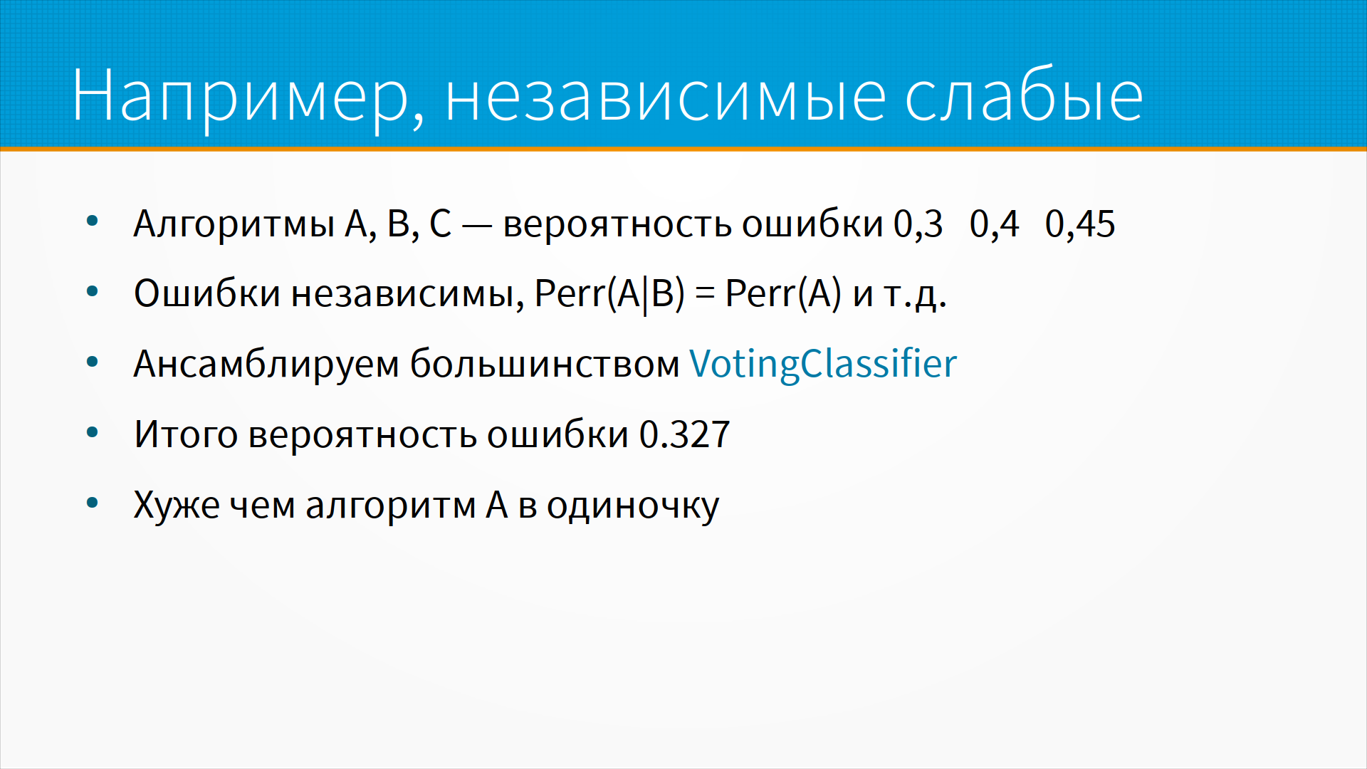 Предположим, что у нас есть независимые слабые алгоритмы A, B и C,