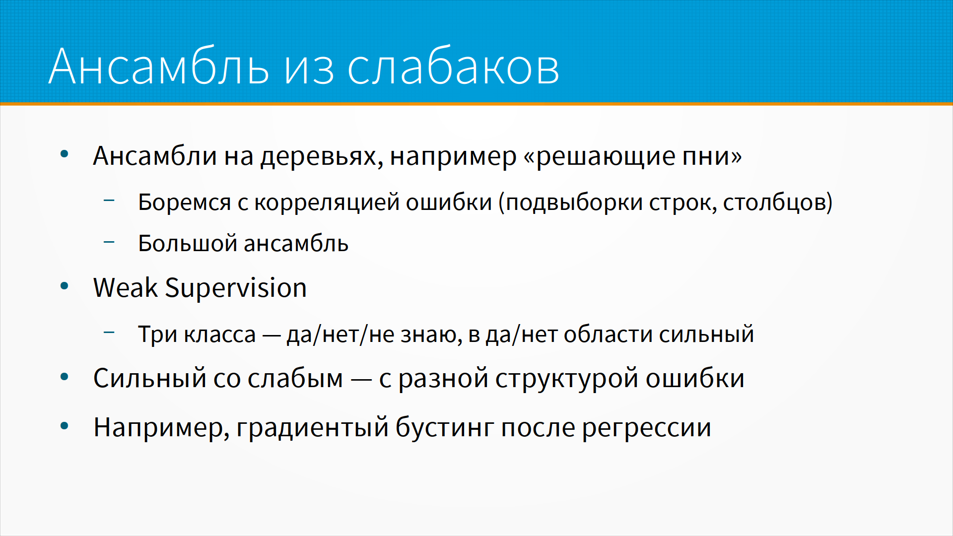 Имеет смысл ансамблировать сильный и слабый алгоритмы с разной структурой ошибки. Например, очень популярное решение - когда мы применяем градиентный бустинг к временным рядам после того, как предсказали этот ряд регрессией или какой-нибудь, например, ARIMA. То есть мы с помощью градиентного бустинга исправляем ошибки предсказания линейной модели. Это работает, потому что структура ошибки у них совершенно разная.