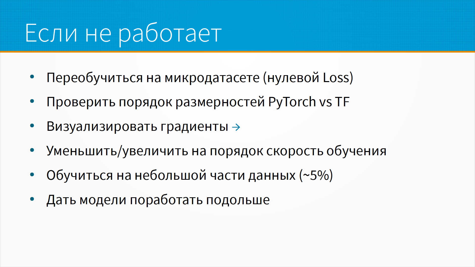 А другая частая проблема - когда портируют модели из TensorFlow в PyTorch и обратно, а у них разная размерность батчей. То есть у них в этих четырех размерностях две размерности стоят не на привычном месте, и многие люди делают эту ошибку. Надо визуализировать градиенты, чтобы смотреть, что с ними происходит. Искать взрыв градиентов или затухание градиентов при обучении. Если модель не учится, всегда имеет смысл увеличить или уменьшить на порядок скорость обучения. Посмотреть, как она будет учиться.