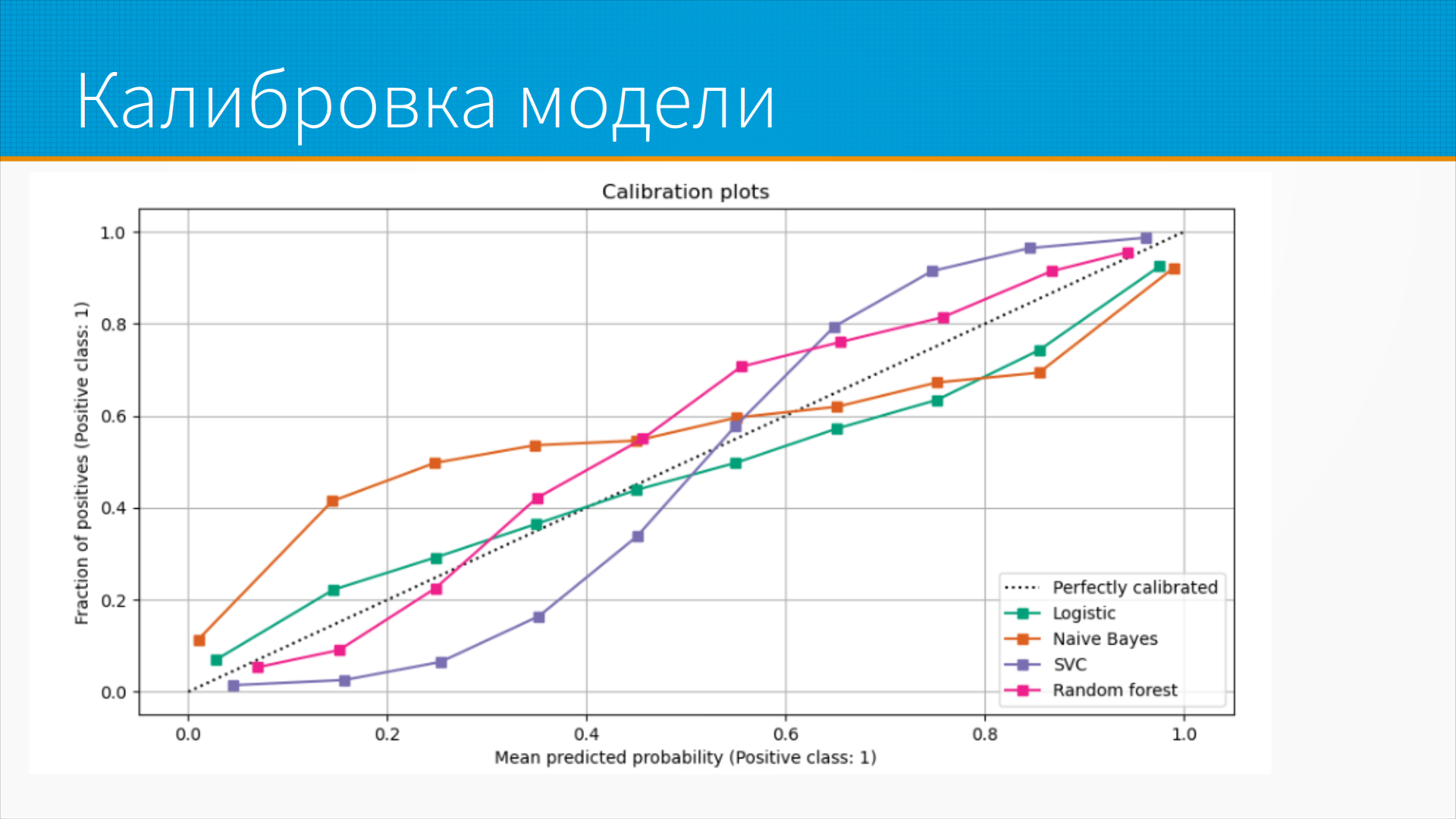 Ну и, кстати, есть такая городская легенда, что логистическая регрессия не требует калибровки, что она выдает откалиброванные вероятности. На самом деле нет. Все модели отдают некалиброванные вероятности, просто логистическая регрессия теоретически тут должна была быть гораздо лучше.