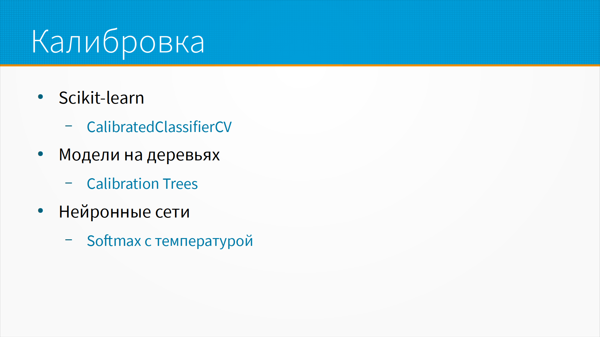 И для нейронных сетей самый хороший вариант их калибровки - это использовать softmax с температурой. То есть, как правило, на выходе классификатора стоит softmax - функция, которая приводит сумму вероятности к единице, повышает вероятность самого вероятного класса и снижает вероятность менее вероятного класса. И вот в эту формулу вычисления softmax можно добавить константу, так называемую температуру, которая сделает решение модели более или менее категоричными.