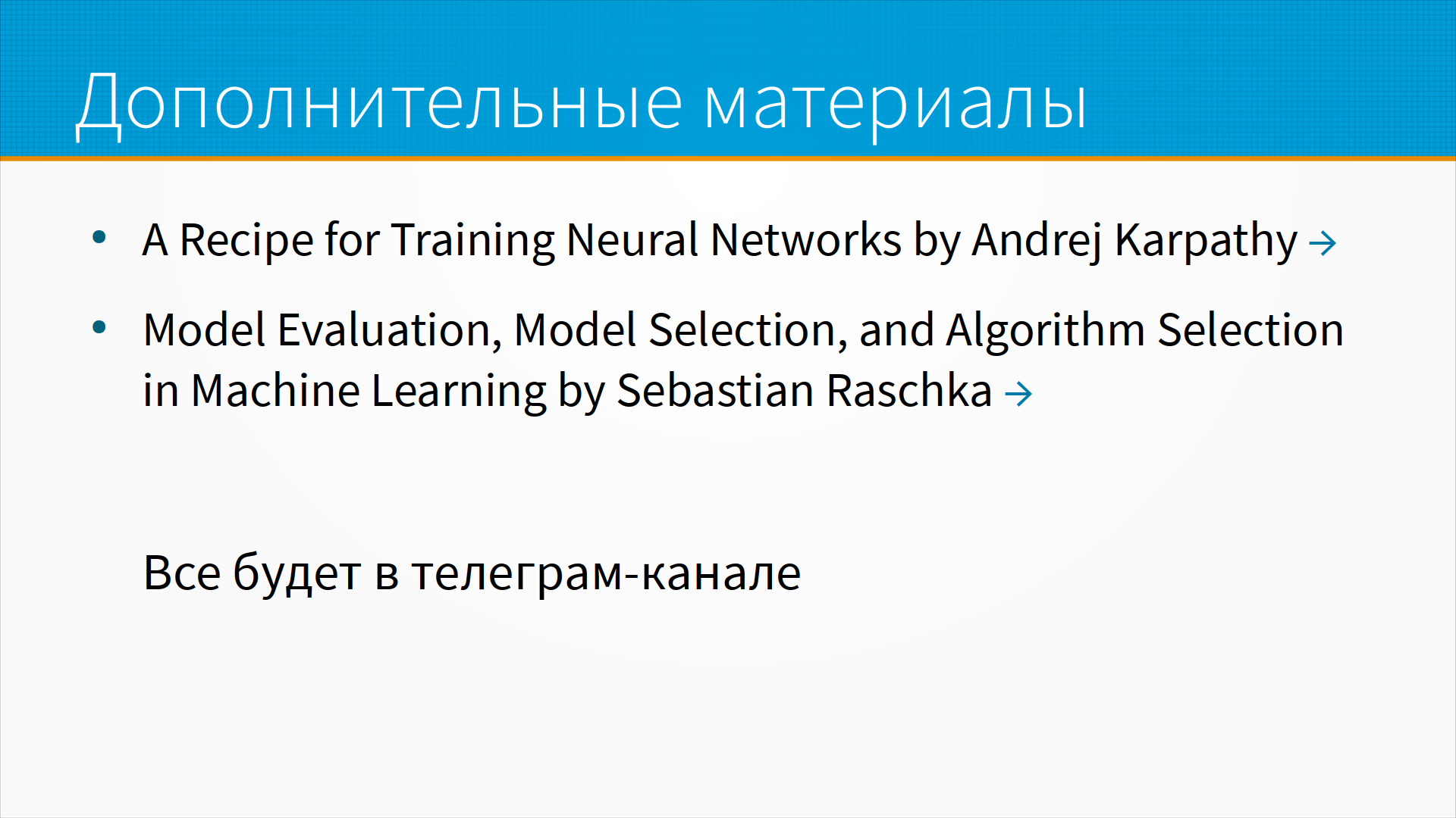 Еще может получиться так, что ваша модель учится, просто она делает это очень медленно. Ну, например, потому что задача сложная. И тут хорошо взять пять процентов данных и попробовать обучить модель на них. Посмотреть, как она будет учиться и как она будет себя вести. Ну и, как я уже говорил, просто дать модели поработать побольше.
