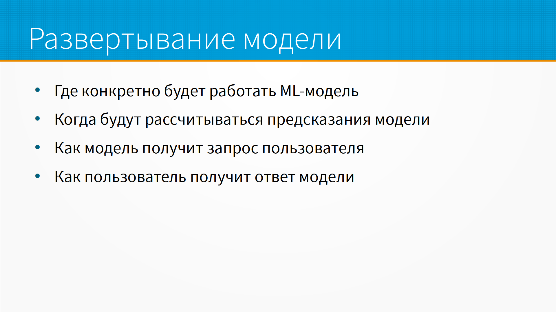 Архитектура развертывания модели определяет, где конкретно будет работать ML-модель, когда будут рассчитываться предсказания модели, как модель получит запрос пользователя и как пользователь получит ответ модели.