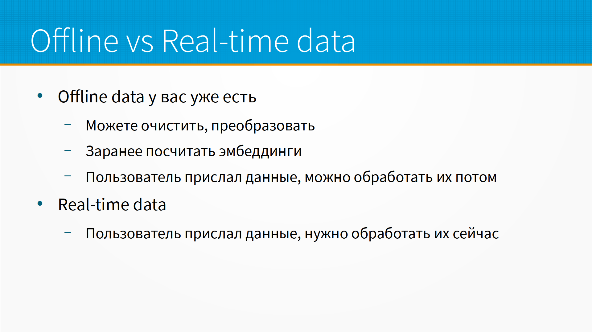 Как правило, у нас есть разница между оффлайн и онлайн данными. Оффлайн данные - это данные, которые у вас уже есть на момент, когда пользователь к вам обратился. Это либо ранее собранная информация пользователя, либо какая-то ваша внутренняя информация, которая хранится у вас в базах данных, либо информация, которую вы забираете из внешнего API - то есть в любом случае это данные, которые уже готовы. Пользователь прислал данные вам, вы можете обработать их потом, посчитать эмбеддинги и, когда он к вам обратится, у вас уже есть насчитанные эмбеддинги и вам не нужно их считать.