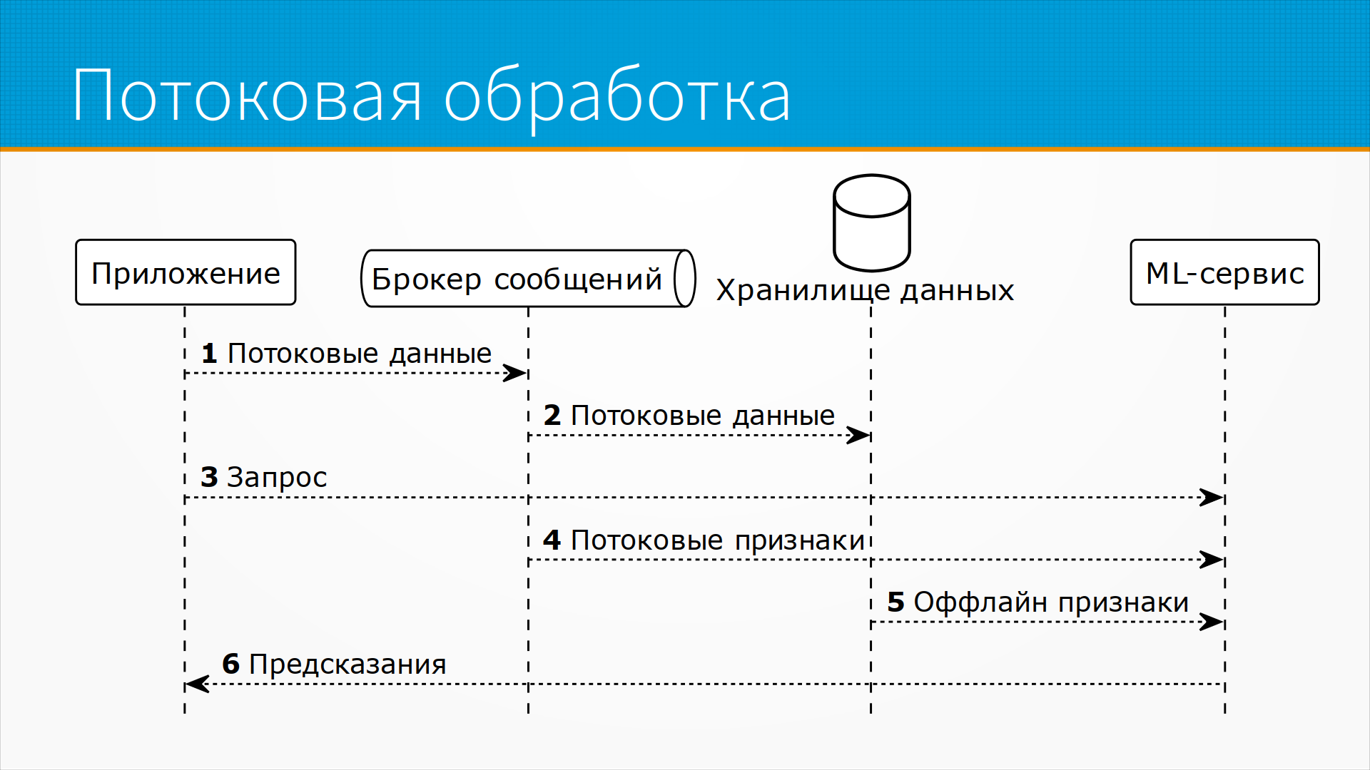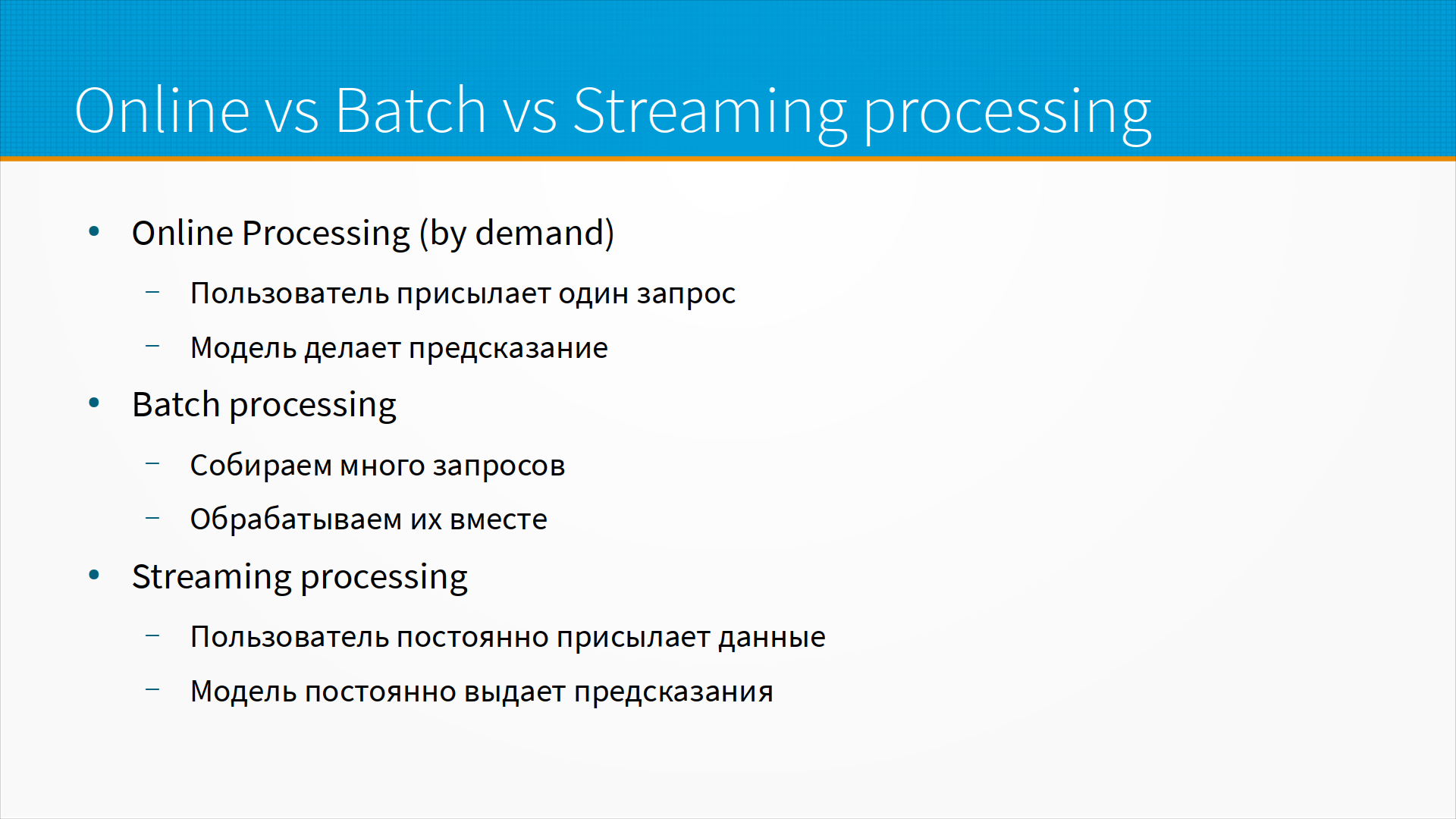 И stream processing - потоковая обработка, когда пользователь постоянно присылает данные, модель постоянно или по запросу пользователя выдает предсказания.