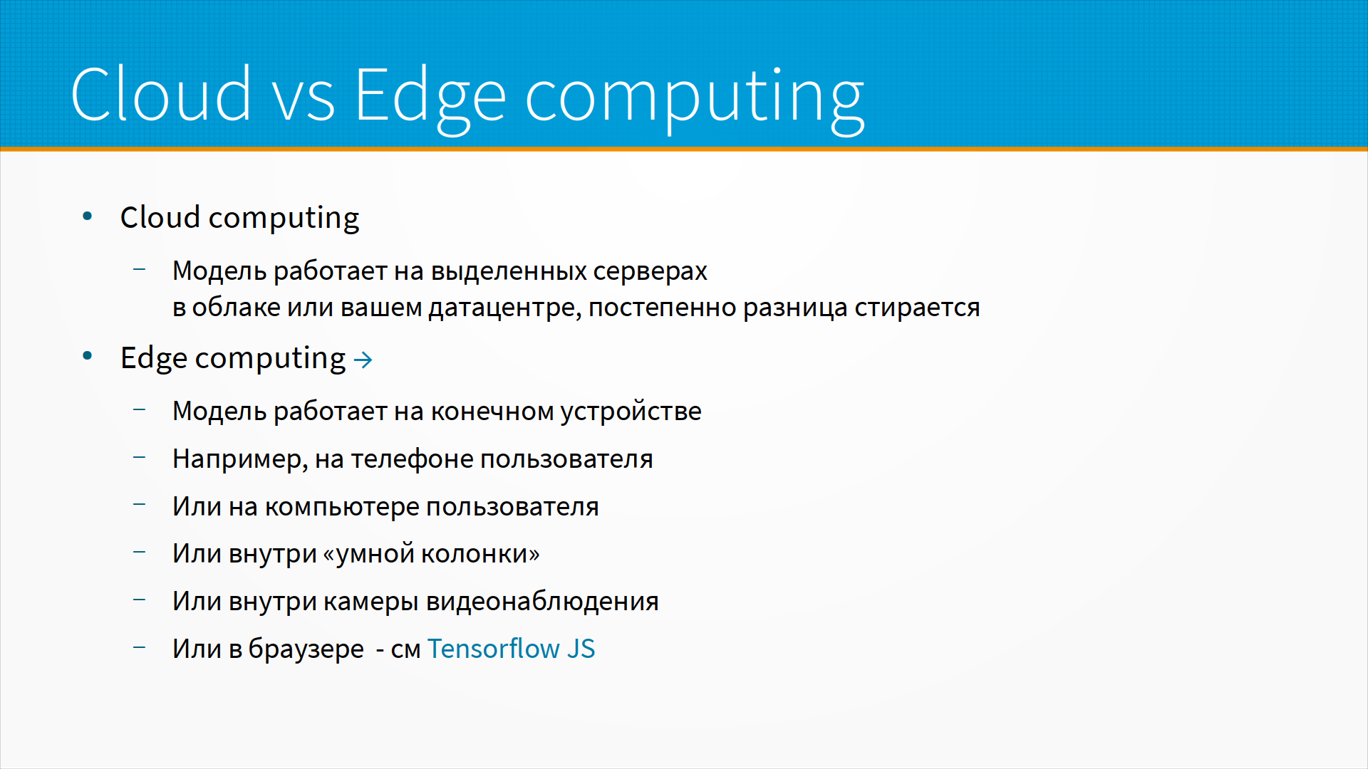 И edge computing - это ситуация, когда модель работает на устройстве конечного пользователя, например, на его телефоне или на его компьютере, или внутри умной колонки Алисы или Alexa, или внутри камеры видеонаблюдения. Есть библиотека TensorFlow JS, которая позволяет запускать модели машинного обучения прямо в браузере.