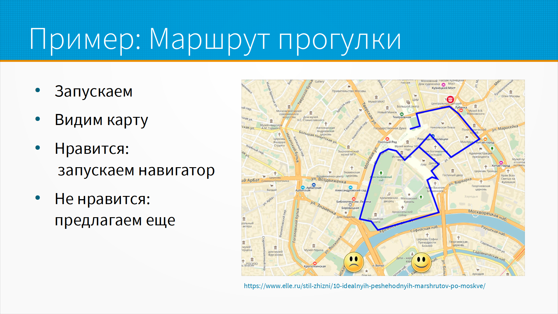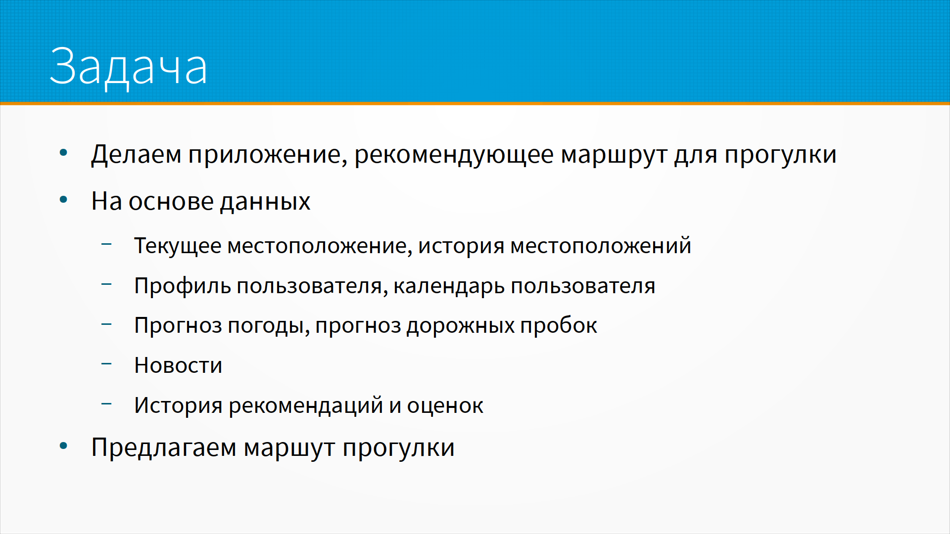 Давайте на примере разберем, как мы могли бы принимать такие решения. Пусть мы разрабатываем приложение, рекомендующее маршрут для прогулки, то есть на основе данных о текущем местоположении, истории местоположений, с учетом профиля пользователя, его календаря, прогноза погоды, новостей и истории рекомендаций, мы предлагаем ему маршрут прогулки, который, как мы думаем, ему понравится, а пользователь оценивает, понравился ли маршрут или нет.