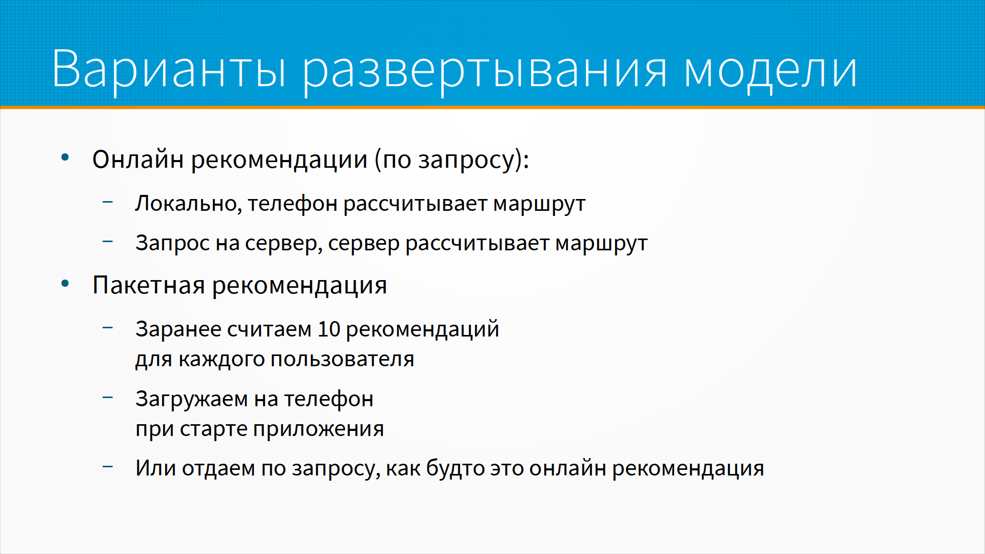 Другой вариант - тоже онлайн рекомендации, приложение отправило запрос на сервер, и сервер, у которого базы все свежие, которые он обновляет сам у себя, рассчитывает маршрут. В этом случае и базы данных, и сама модель лежат на нашем сервере, а модель запрашивает рекомендацию и сразу же получает маршрут.