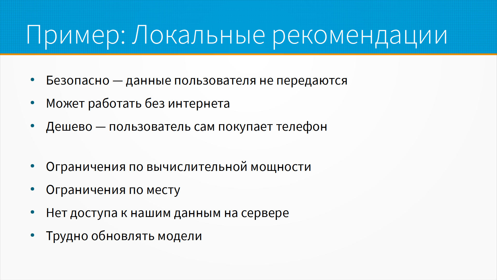У нас есть ограничения по вычислительной мощности, то есть все-таки телефон может быть не очень мощным, и, даже если он очень мощный, все равно в него не влезет все, что мы хотим туда запихать. Там есть ограничения по месту, нет доступа к нашим закрытым данным на сервере и трудно обновлять модели. Причем не только трудно обновлять модели на компьютере пользователя, на мобильном телефоне пользователя, но и трудно дообучать наши модели, то есть для того, чтобы мы могли дообучать нашу модель на обратной связи пользователя, нам нужно, например, запускать что-нибудь типа federated learning, доучивать модель на телефоне пользователя, это сложная и дорогая история.