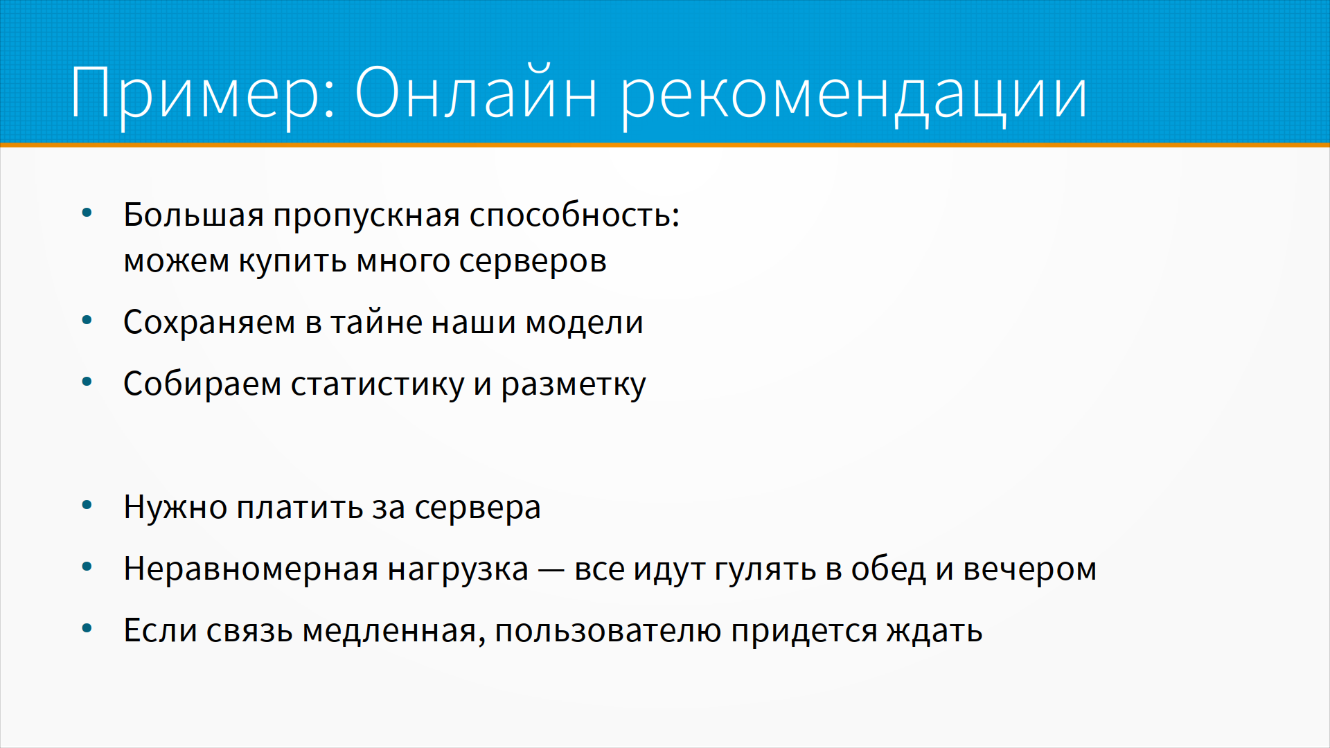Это отличное решение для пользователя при условии, что у него быстрая сеть, потому что мы ее будем грузить постоянно отправкой данных туда и подкачкой новых рекомендаций отсюда. И это большая вычислительная нагрузка на наши сервера, потому что мы вынуждены считать модель не один раз в день, не пятьдесят раз в день, а, может быть, раз в несколько секунд.