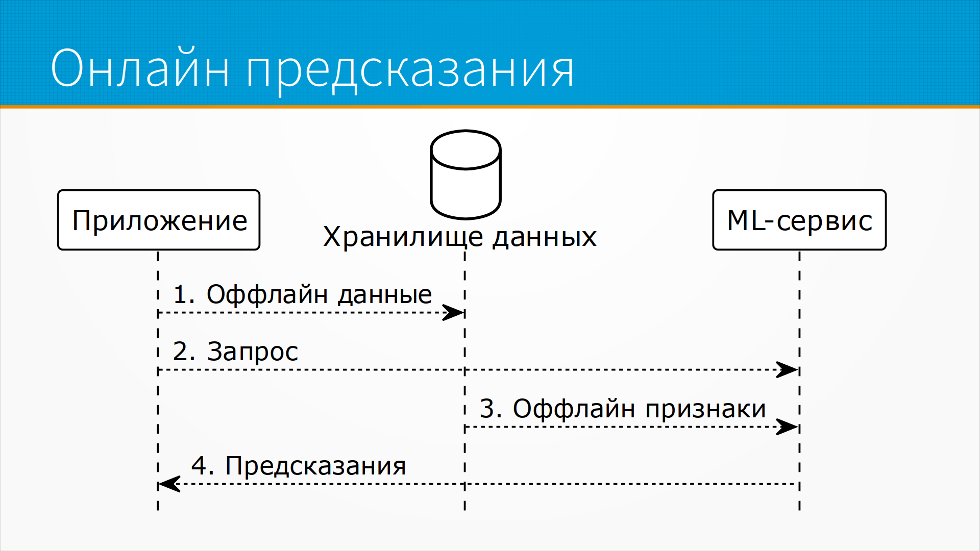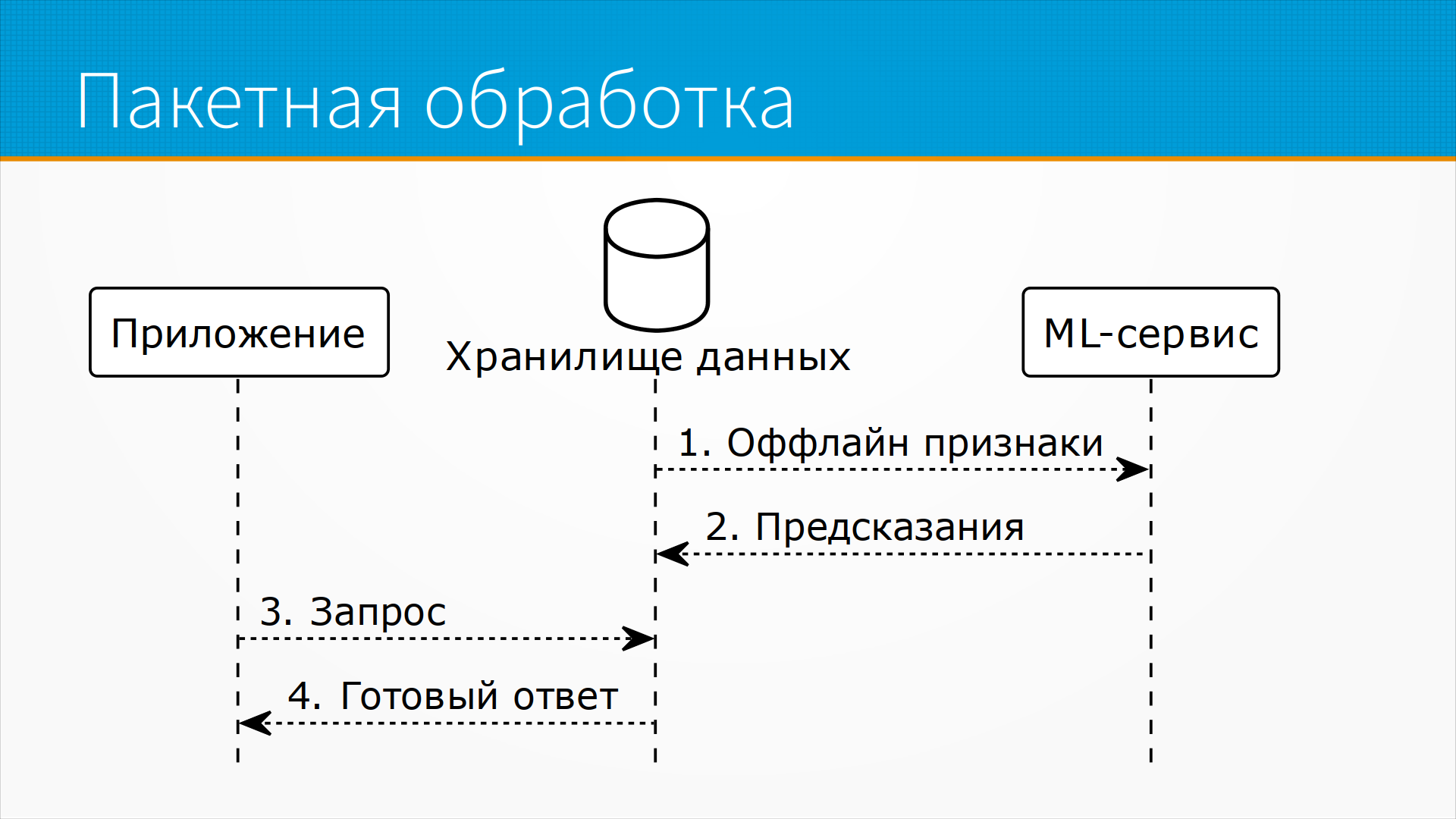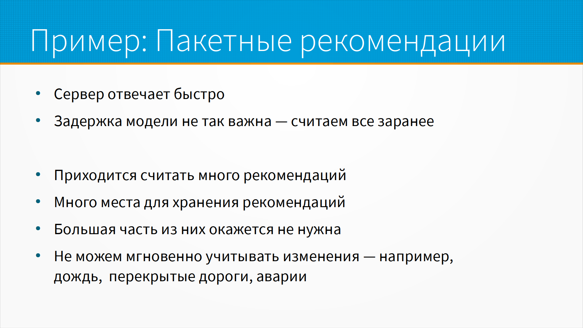 Другой вариант - это пакетная рекомендация. Предположим, что мы ночью для каждого пользователя считаем 10 рекомендаций на основании его истории, прогноза погоды и так далее. При старте приложения мы их загружаем на телефон, пользователь мгновенно получает рекомендацию - или мы отдаем по запросу, как будто это онлайн рекомендация. То есть к нам обратились за онлайн-рекомендацией, а мы вместо того, чтобы их считать, отдаем сохраненные рекомендации.