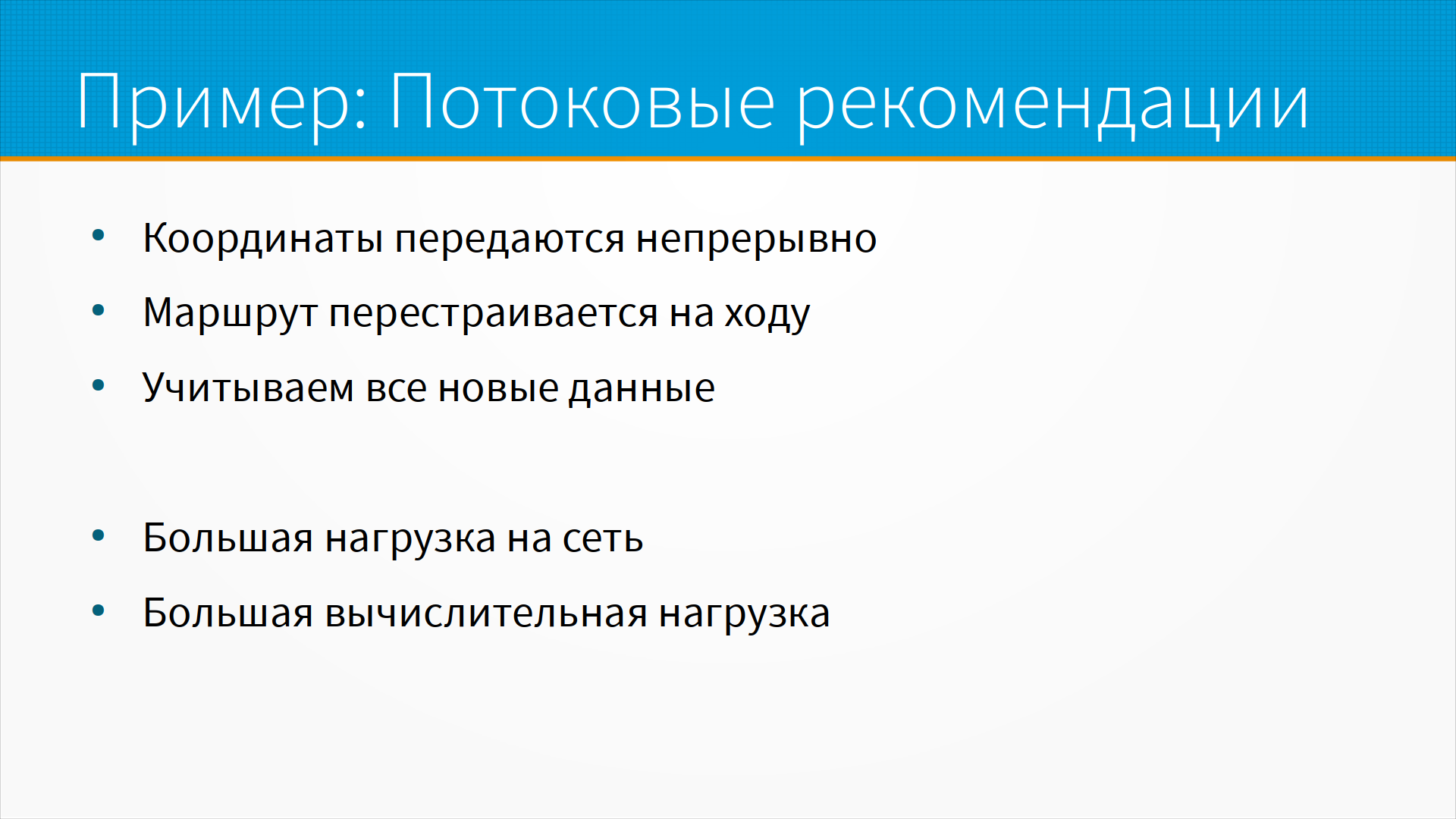 В ситуации с потоковыми рекомендациями у нас разнесена обработка данных и их сохранение. То есть, координаты передаются непрерывно из приложения пользователя, маршрут перестраивается на ходу, и время от времени приложение запрашивает изменения маршрута, новые рекомендации и так далее.