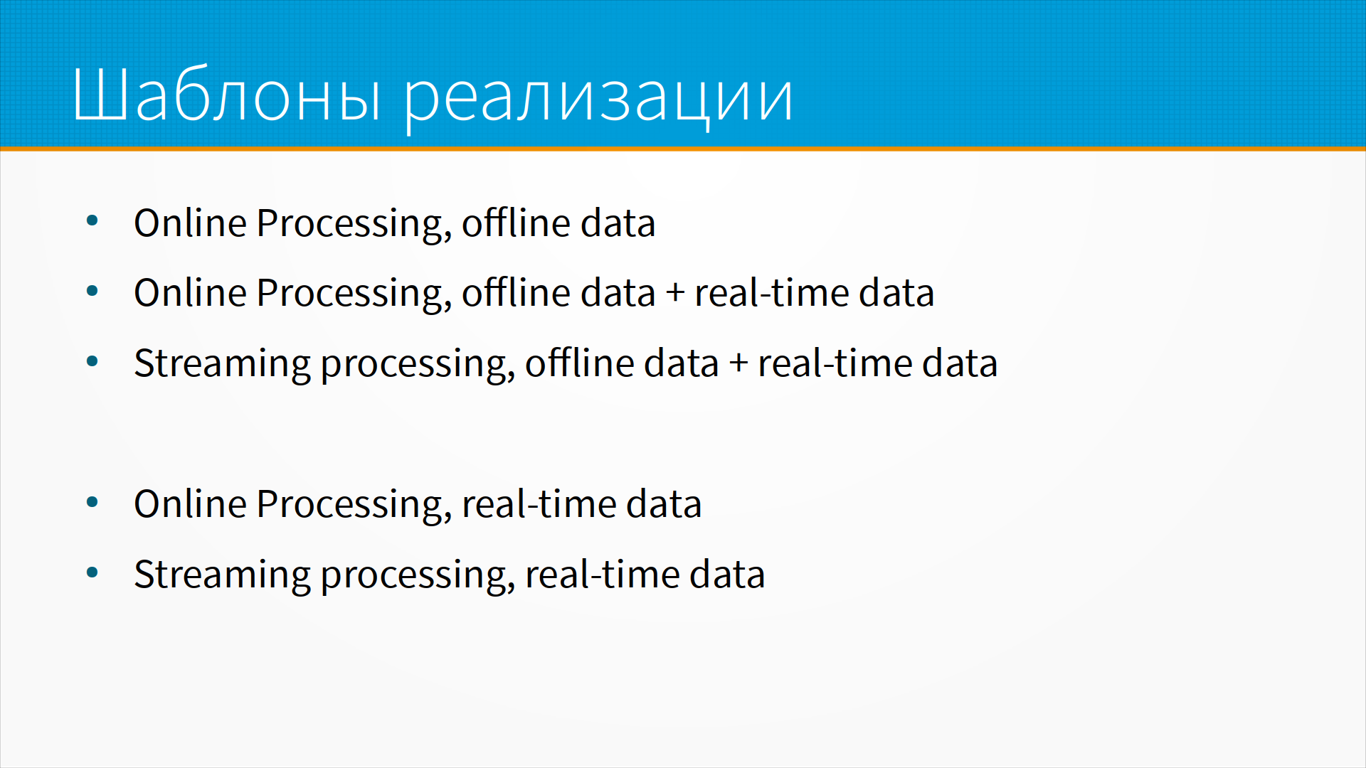 Два остальных шаблона - Online Processing, real-time data и Streaming processing, real-time data - обычно неудачны при развертывании. То есть это те же самые, что и второй и третий шаблон реализации, мы просто отказались от предрассчитанных данных на доступных нам оффлайновых данных, то есть они просто более дорогие вычислительно при реализации, поэтому мы разберем первые три.
