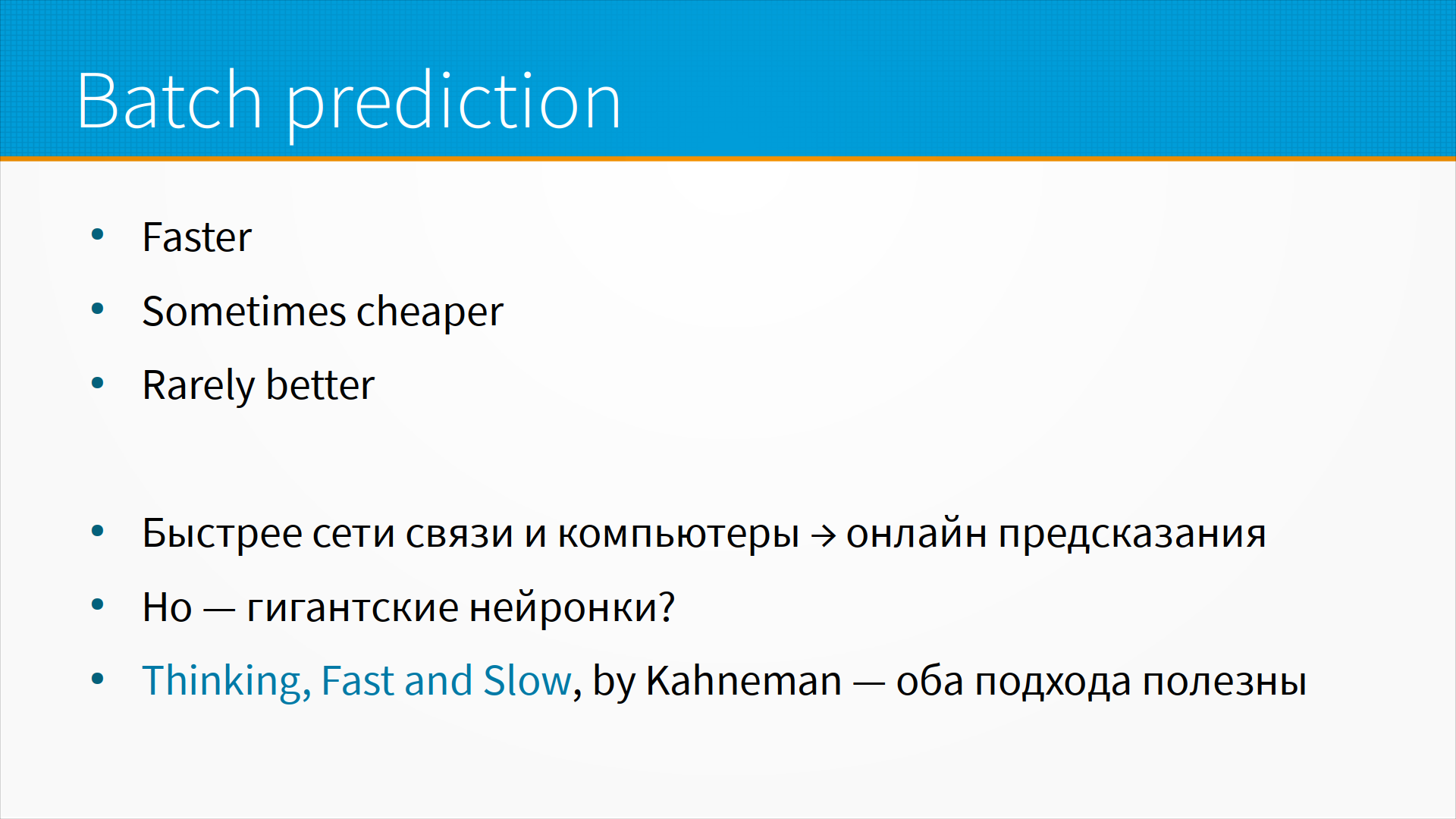 Но параллельно к тому, как становятся быстрее сети связей и компьютеры, нейронки становятся огромнее, их предикты все еще медленны, и получается, что мы разумно можем сочетать как пакетную обработку для каких-то медленных предсказаний, так и онлайн обработку для быстрых предсказаний.