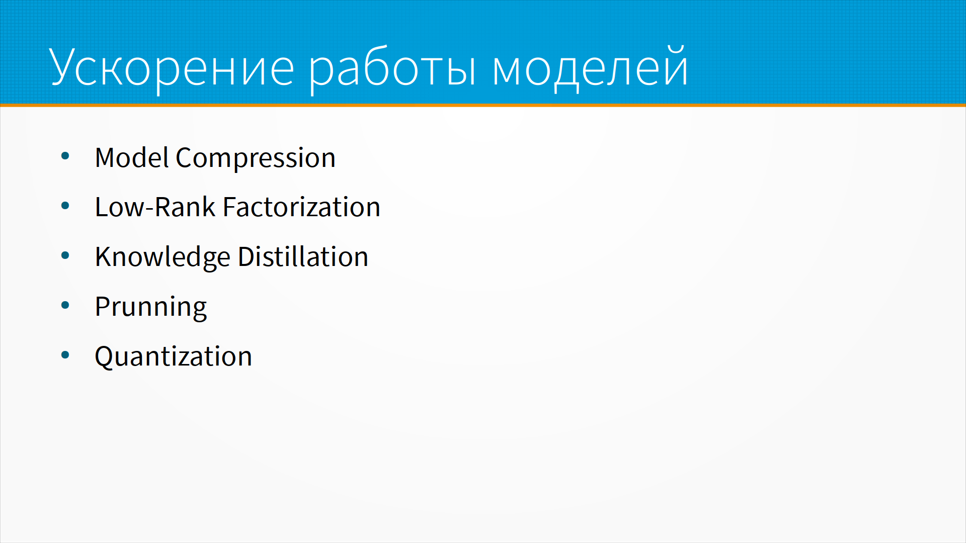 Как мы можем ускорить работу модели? Основные подходы это сжатие модели, low-rank factorization внутри модели, knowledge distillation, pruning и quantization.