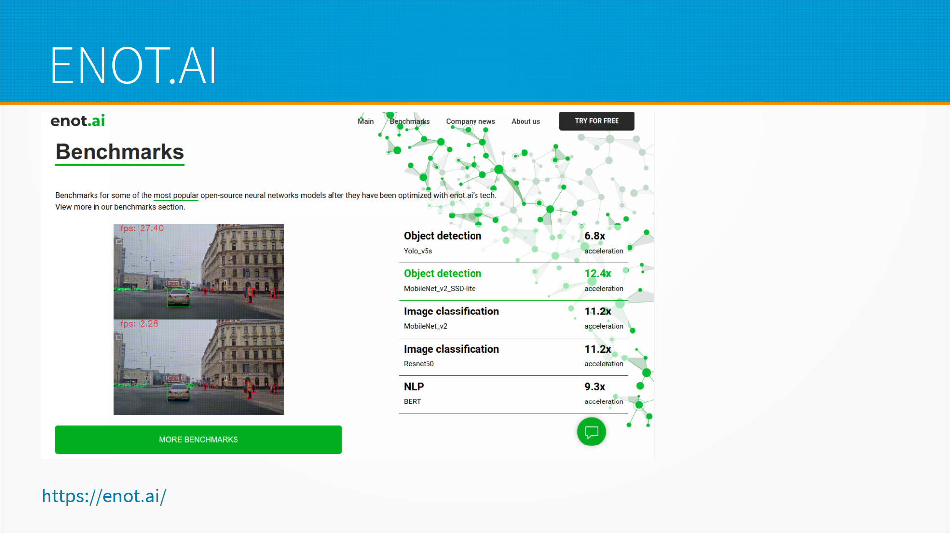 Quantization, pruning и все такое редко делают вручную. Обычно используют какие-нибудь библиотеки для ускорения инференса модели, и первое, о котором стоит поговорить - это ENOT.AI, ее разрабатывают ребята тут же из Новосибирского университета, рядом с ним, то есть не из университета, но они из него вышли. И она позволяет очень здорово ускорить inference моделей компьютерного зрения, ну, и в последнее время они научились и NLP-модели разгонять, ENOT.AI.