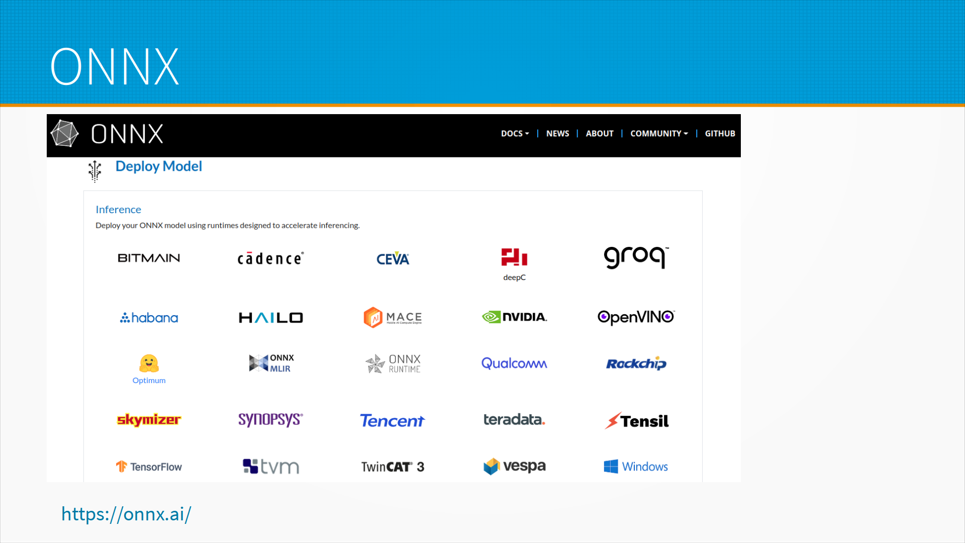 ONNX - это библиотека от Microsoft и стандарт представления моделей, в которой можно сконвертировать модели многих фреймворков, и существует ONNX runtime, который эти ONNX модели может исполнить.