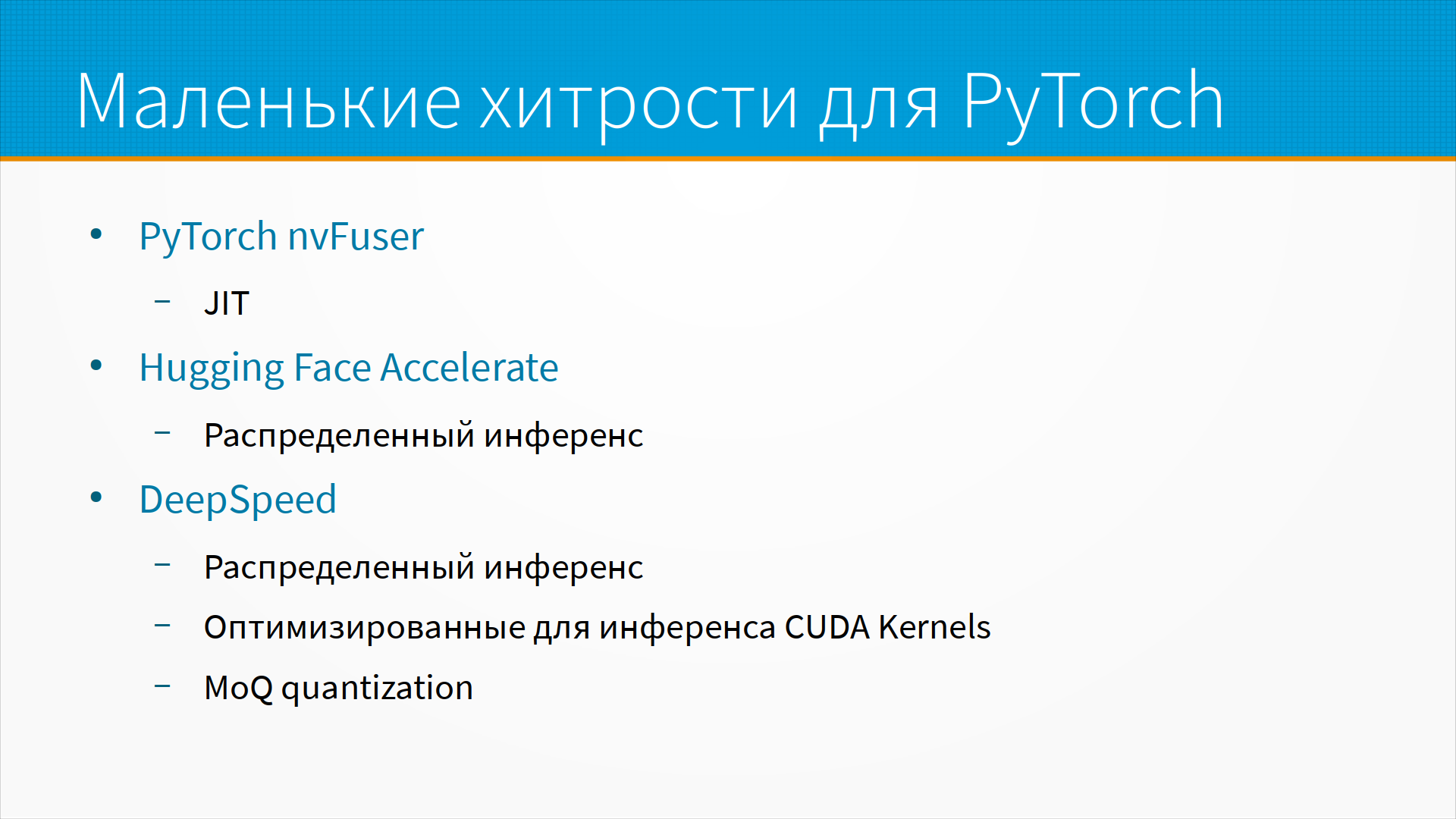 И DeepSpeed позволяет делать распределенный inference, у него есть оптимизированные для инференса CUDA kernels, это как раз тот самый случай, когда какие-то вещи нам нужны для обучения модели, но не очень нужны для инференса, и там есть умная квантизация, обычно Accelerate и DeepSpeed используют вместе.