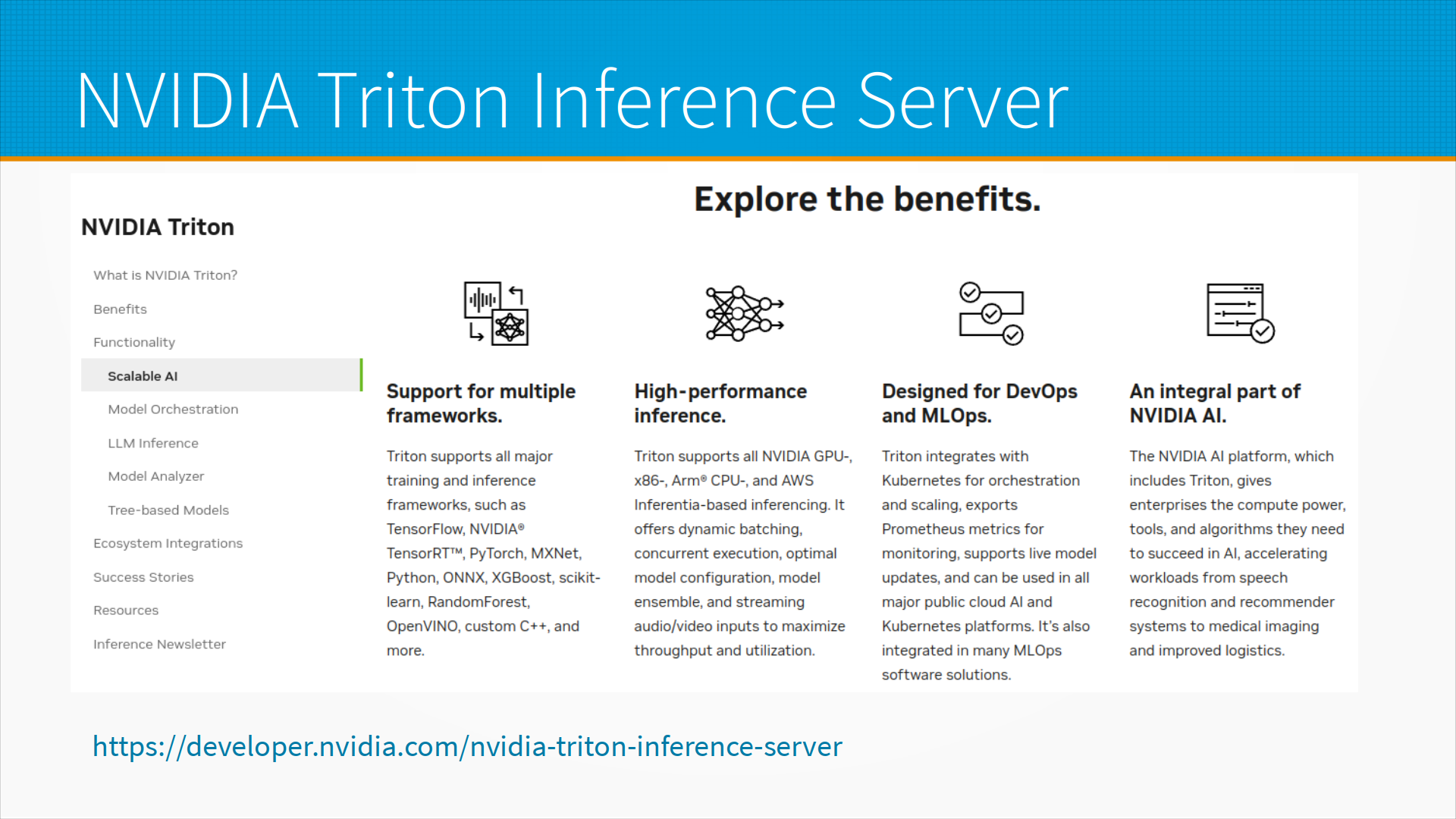 NVIDIA Triton Inference Server - это отраслевой стандарт для инференса моделей на GPU NVIDIA, туда можно выгрузить модели, написанные на разных фреймворках, то есть TensorFlow модели вы можете там сервить, PyTorch модели, он имеет много хороших инструментов для развертывания моделей, интеграции в ваш MLOps, и он развивается NVIDIA - соответственно все, что есть интересного в NVIDIA картах, он умеет использовать.