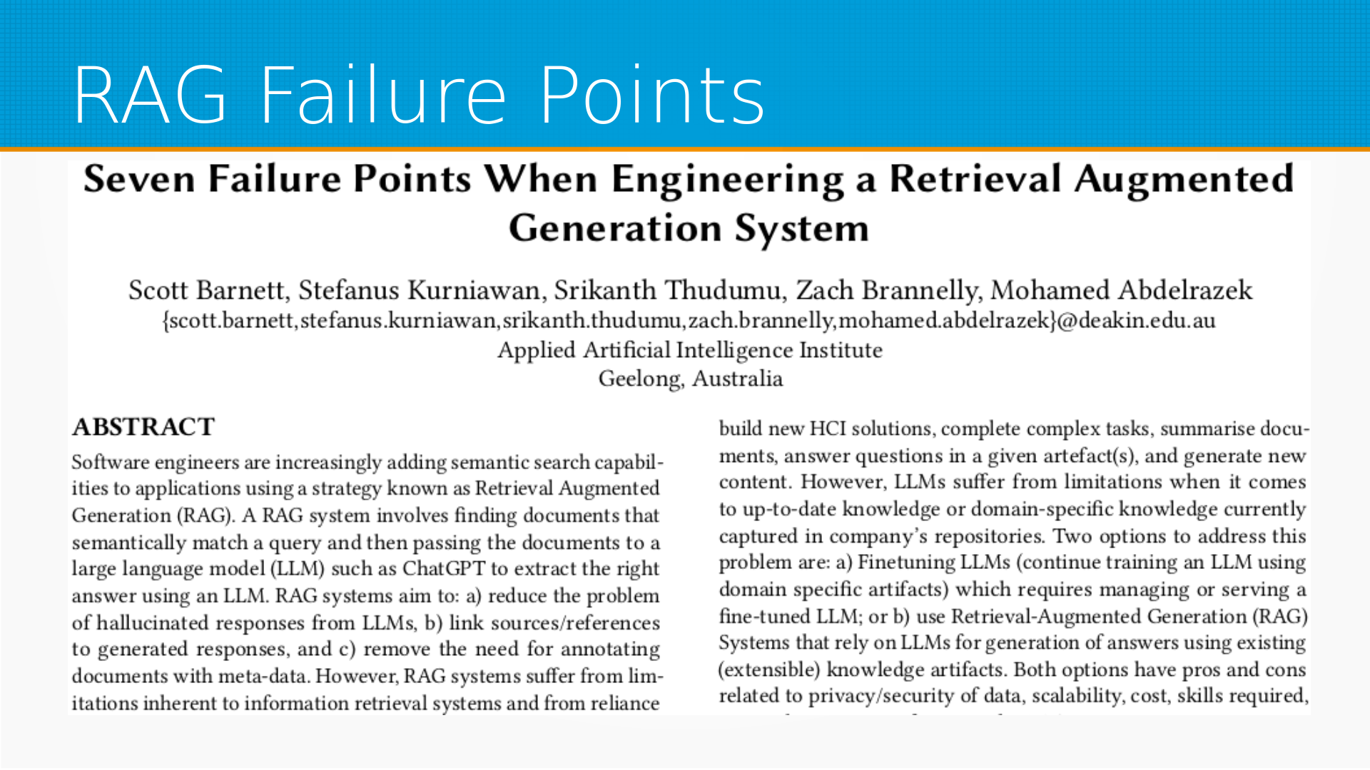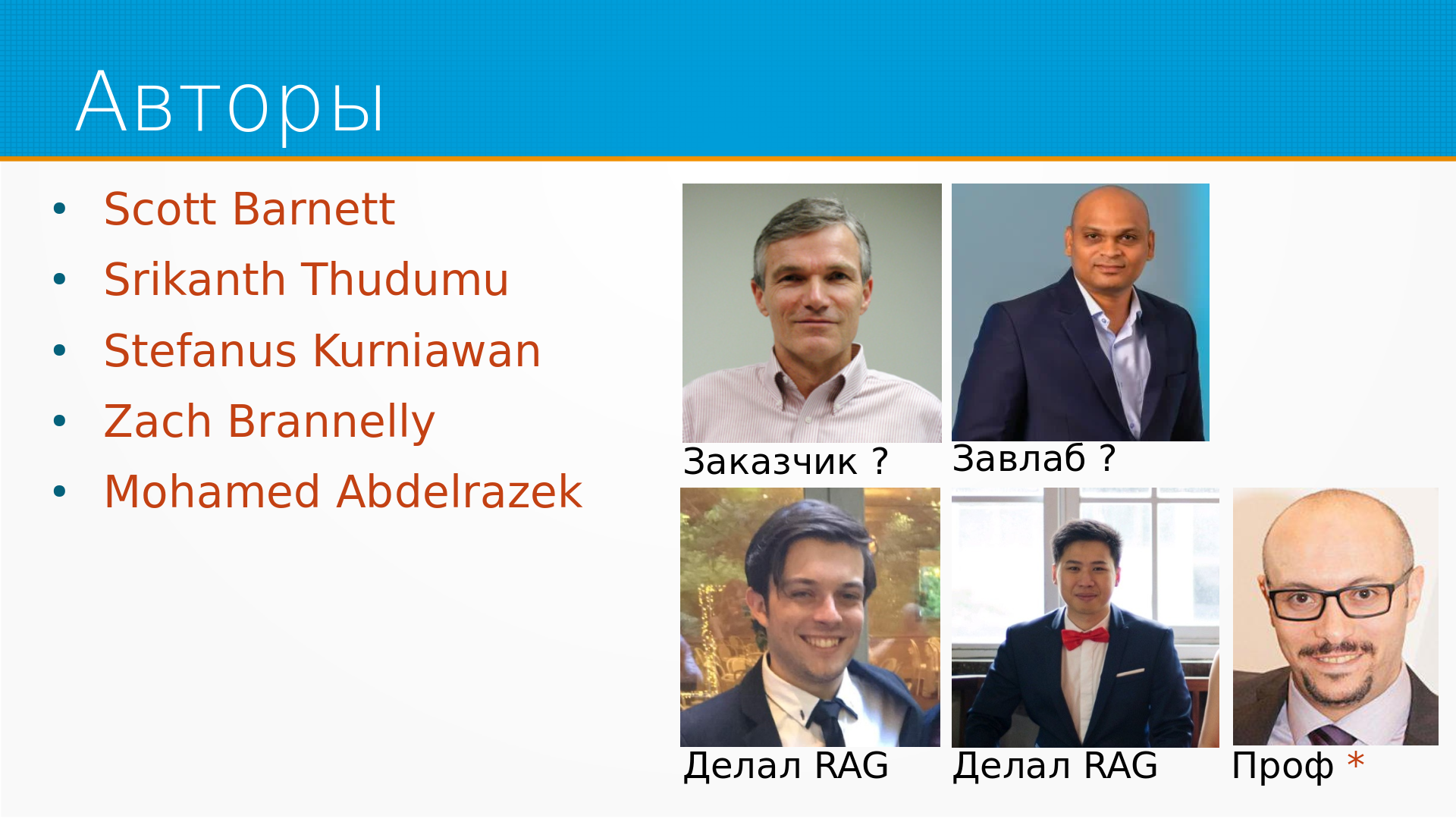 Ну, отлично. Я хочу рассказать про эту статью, потому что мы как раз сейчас занимаемся RAG, и я все связанное с RAG читаю, и некоторые статьи интереснее, чем другие. Статья «Seven Failure Points When Engineering a Retrieval Augmented Generation System. Статья написана группой австралийских исследователей. Я про них ничего раньше не знал, пошел смотреть, кто они такие и почему они вообще пишут такие статьи.