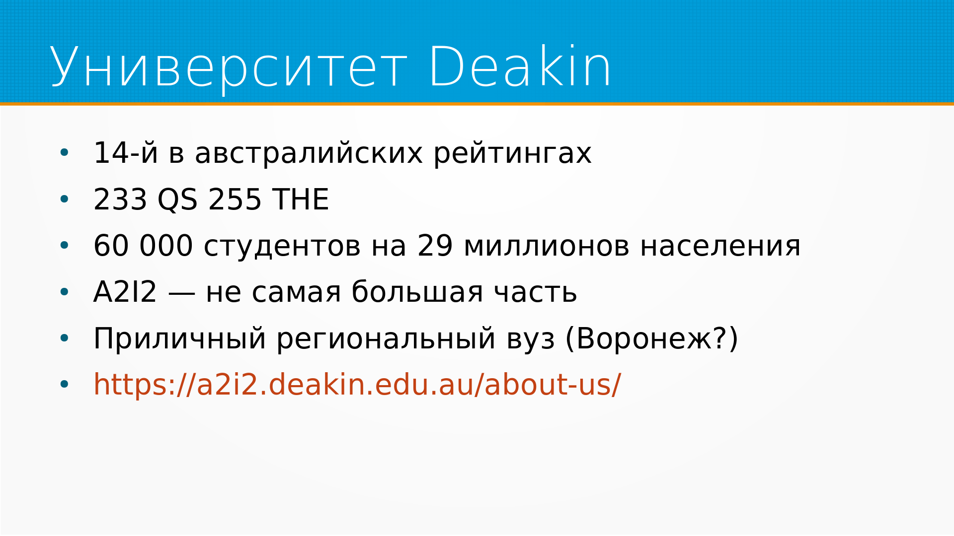 Университет Deakin, австралийский университет. Довольно-таки большой, 60 тысяч студентов. Это при 29 миллионах населения Австралии. 14-й в австралийском рейтинге, то есть там еще 13 университетов круче, чем этот. 200-й какой-то в мировых рейтингах. По ассортименту курсов, и факультетам напомнил мне Воронежский университет.