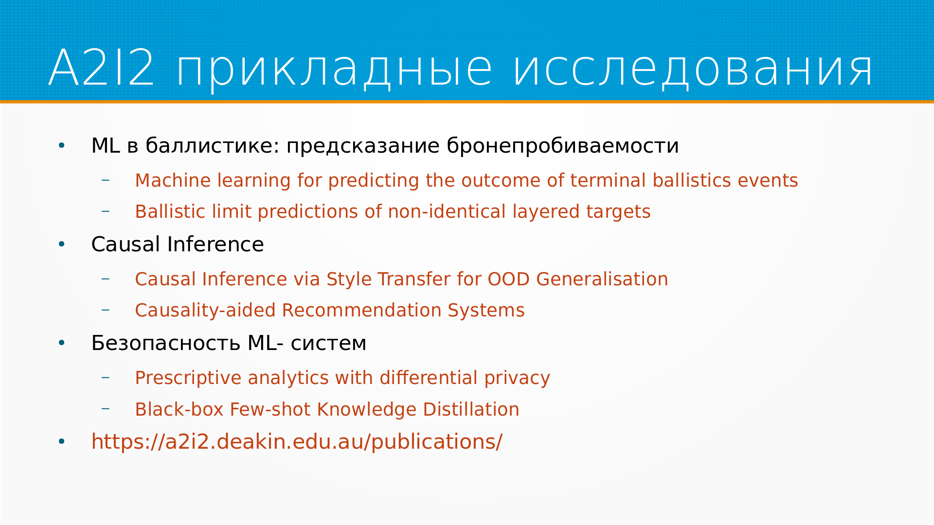 И это конкретно его кафедра, отвечающая за искусственный интеллект. Кафедра довольно практичная, у них есть исследования по машинному обучению в баллистике неожиданно, то есть они предсказывают бронепробиваемость. По causal inference интересные вещи, по безопасности ML систем, в том числе, например, у них интересная статья про то, как ловко воровать чужие модели с минимальным бюджетом. Толковые ребята.