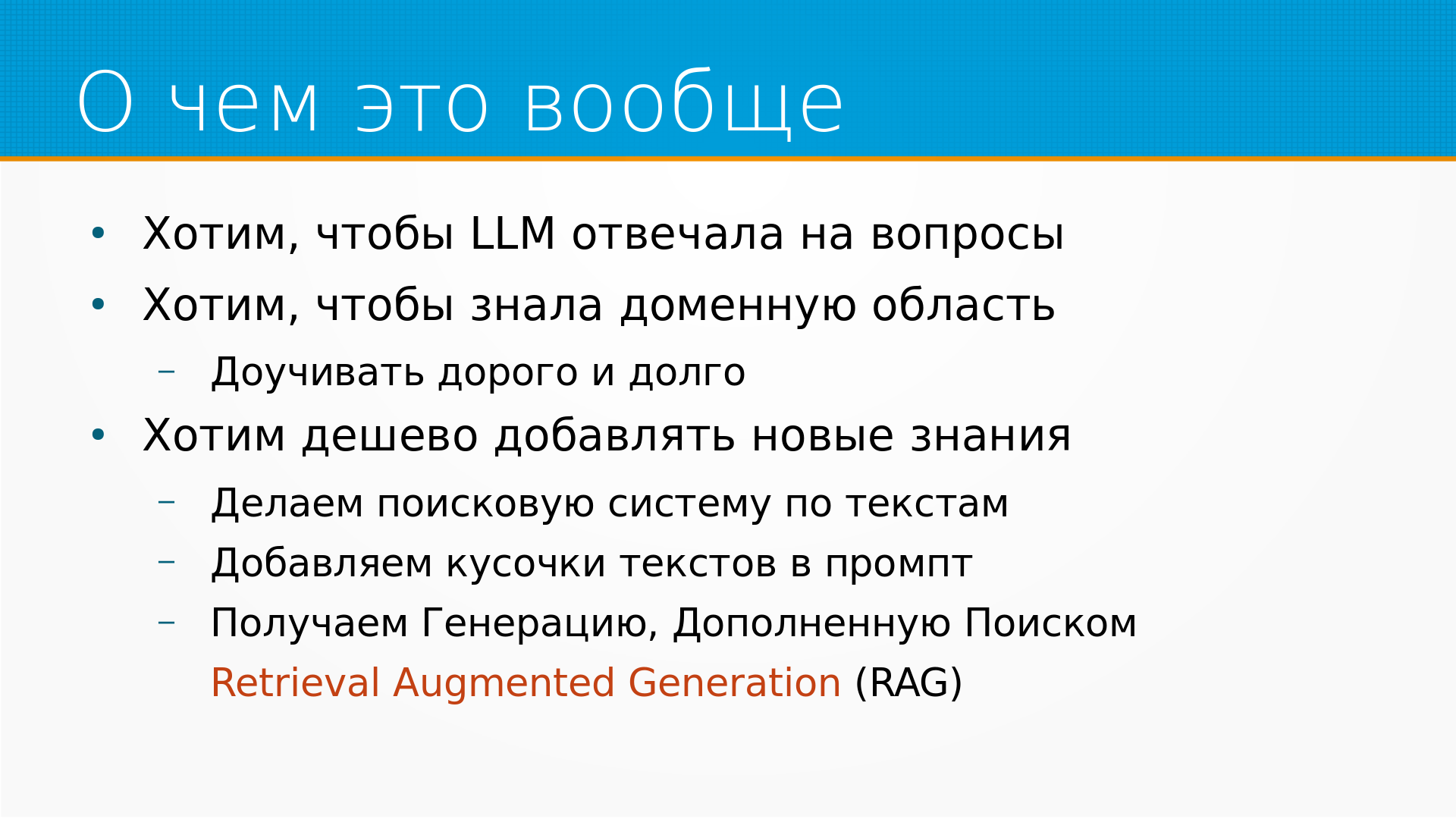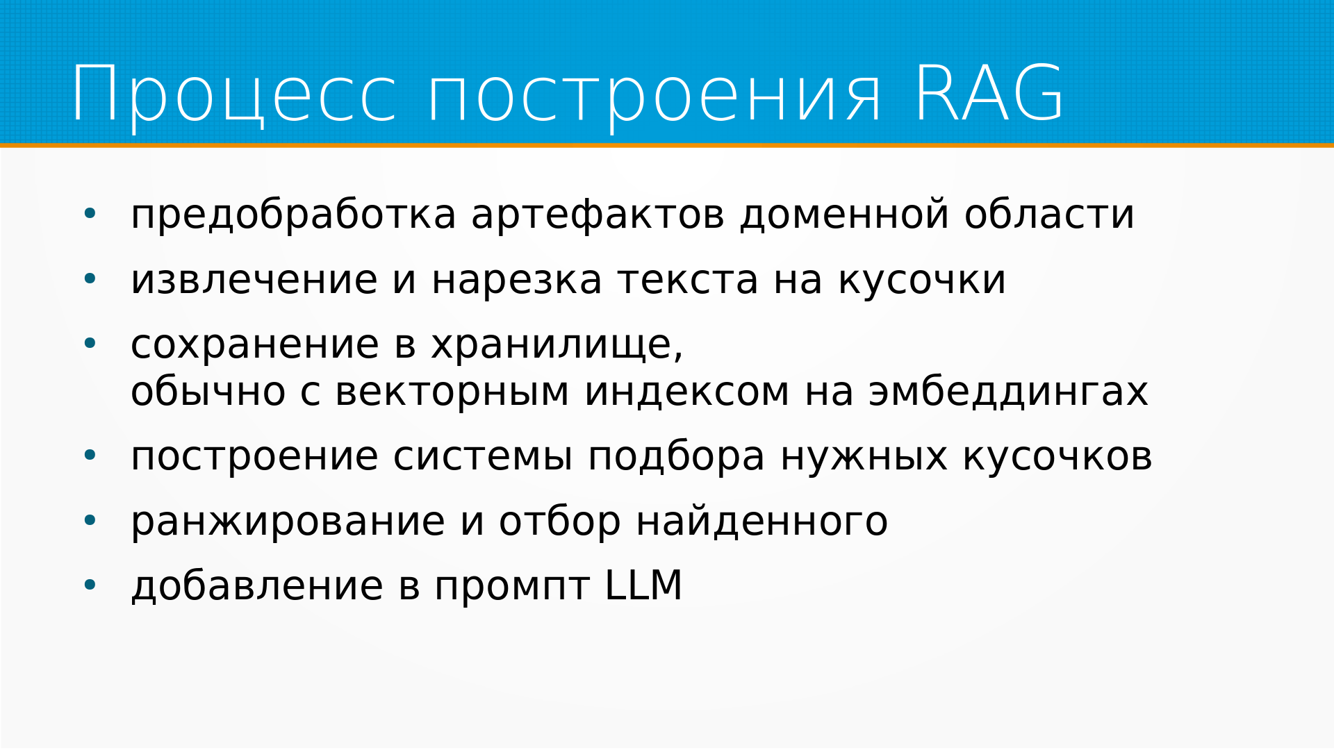 То есть, если посмотреть, как RAG строится, то это прежде всего предобработка артефактов, это их извлечение нарезка, это сохранение и извлечение их из хранилища и, в общем, добавление в промпт-таллим и везде тут можно наступить на кинди-грабли.
