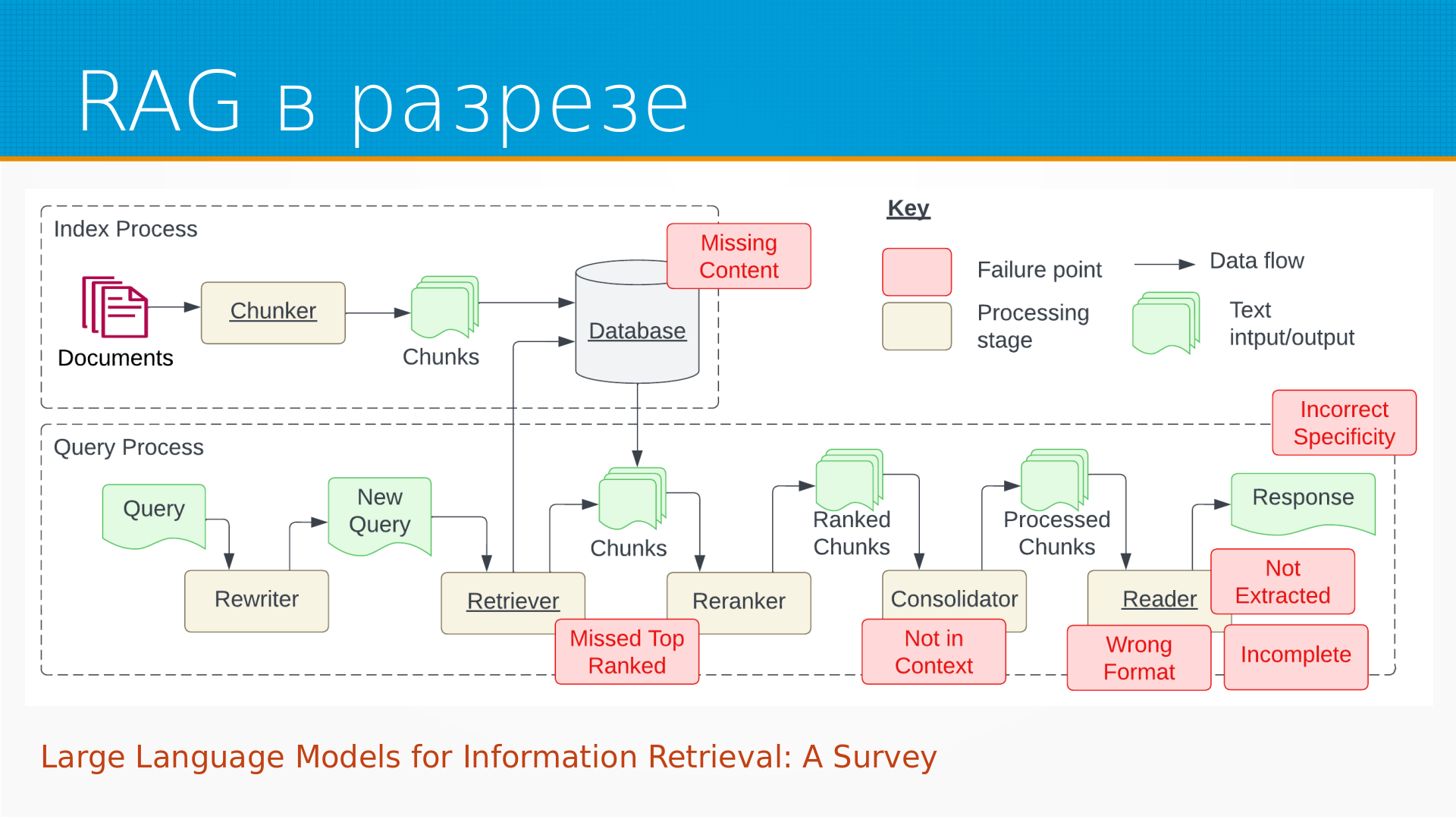 Дмитрий Колодезев: Ну, да, тут ещё некоторые проблемы этой статьи в том, что, ну, в общем, это, конечно, сельский вуз. То есть они говорили о том, что у них болит. Вот. Они не особенно читали чужие статьи. Вот. То есть они просто брали, отважно делали РЭК, смотрели на проблему, записывали их в тетрадочку, ну и вот. Написали об этом статью. На самом деле молодцы. Потому что вот таких статей десяток и в общем можно издавать их учебником по разработке RAG.