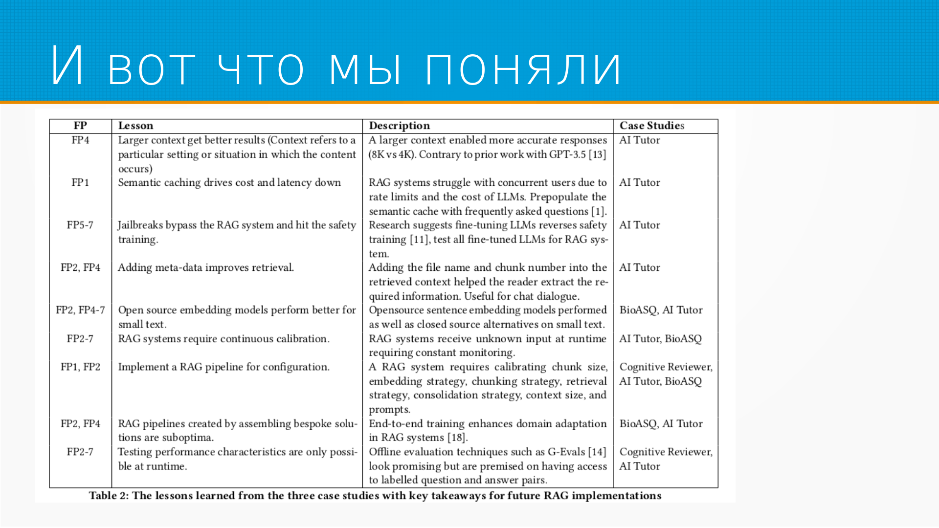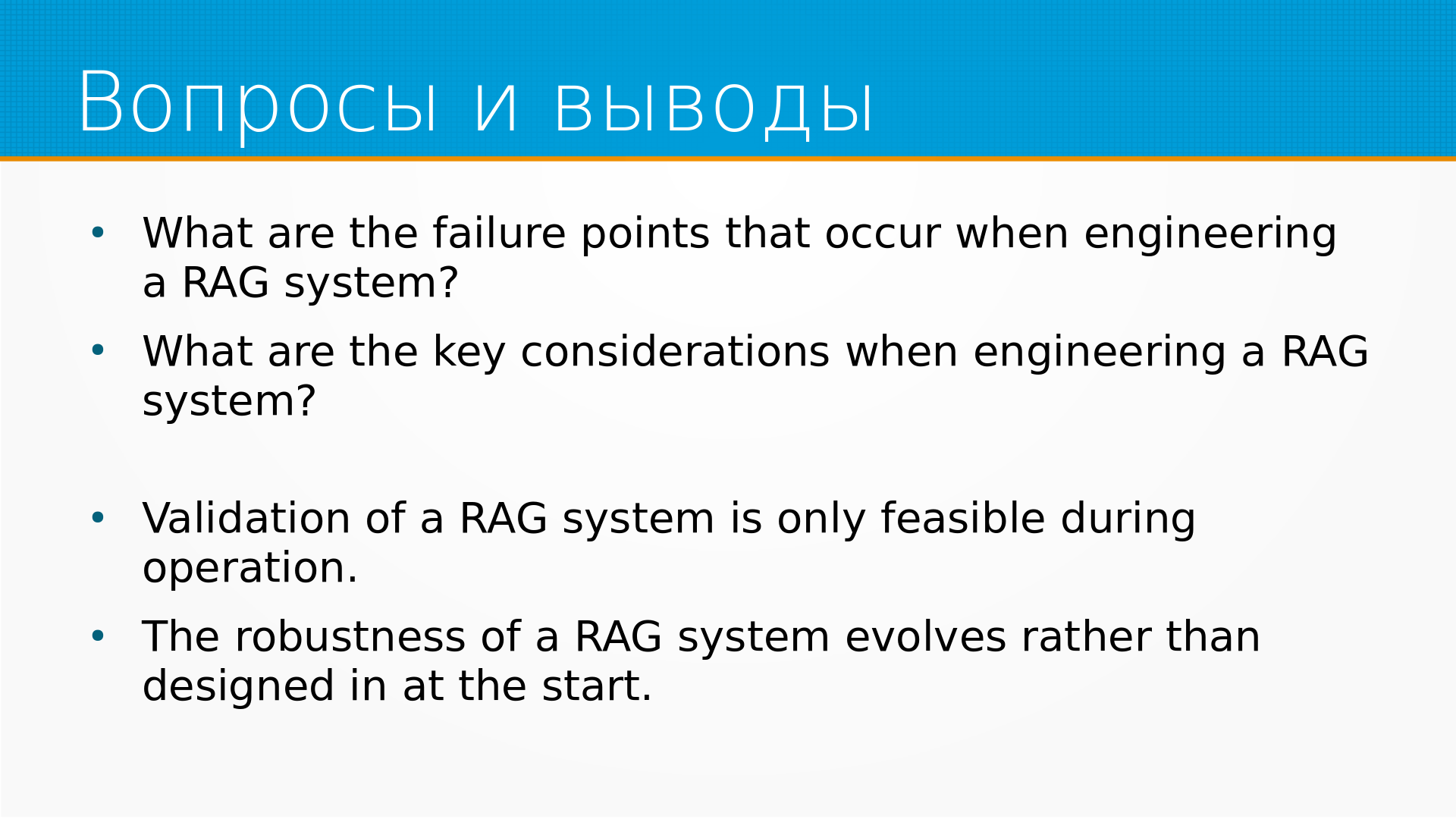 Какие-то вопросы они ставили перед исследованием. На какие грабли обычно наступают, когда такие системы строят? И о чем надо думать, когда мы рэк-системы строим, куда смотреть? Каким выводом они пришли? Что пока мы рэк-систему не построим, мы не поймем, хорошо мы ее задумали или нет. То есть пока не попробуешь, не оценишь. Validation of rэк-system is only feasible during operation. Ну и они говорят, что надежность RAG-системы она такая штука, что вы не можете построить, запланировать надежную RAG-систему. То есть, чтобы вы там не запланировали себе, все равно она будет где-то ломаться, и вам надо ее эволюционировать, а не то, что вы там придумали надежную систему, построили она и сделали. Грустные выводы на самом деле, но... Тем не менее.