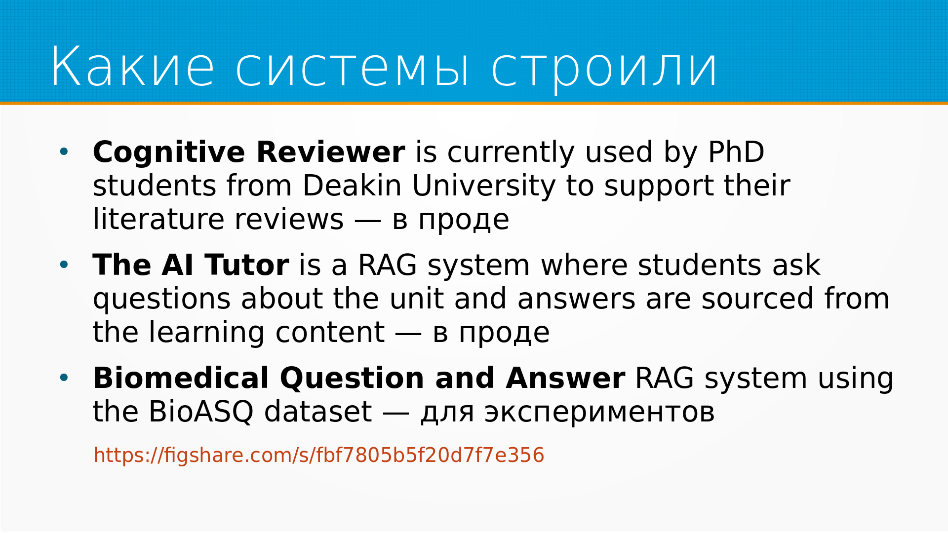 Какие системы они строили? Они построили три вопросно-ответные системы. Первая Cognitive Retriever. Он прямо сейчас используется у них в универе для поддержки аспирантов, помогает делать им литобзоры. То есть это система в проде. AI tutor – система, которая поддерживает студентов во время решения домашних заданий. Студент получает задачу и начинает тупить и говорит «Слушайте, вот что-то я туплю, а почему это вот так получается?» AI Tutior его поддерживает - подсказывает, учит, но ответ не дает, а дает умные, наводящие вопросы. И третью систему, Biomedical Question and Answer, это вот как раз BioACQ датасет. Они с ним экспериментировали, но в прод она у них не вышла. Скорее всего, потому что их не устроило качество.