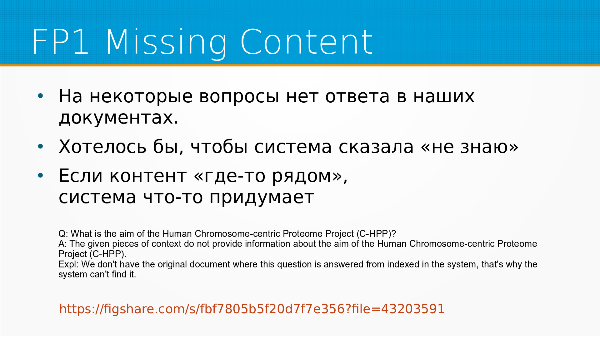 Дмитрий Колодезев: Миссинг контент относится к этой части. Ответа на самом деле нет в базе данных. Как бы мы ничего не спрашивали, как бы не накручивали языковую модель, но нет ответа. Вот. А можно, конечно, сказать, зачем же вы спрашиваете такое, чего она не знает. Но проблема в том, что контент складывают одни люди, а спрашивают другие. И если бы мы заранее знали, что у нее спросят, тогда бы, вообще-то говоря, нам и не надо было языковую модель делать. Мы бы ответы просто написали, и мы отдали бы. Вот. Проблема как раз в том, что мы не знаем, что они спросят.