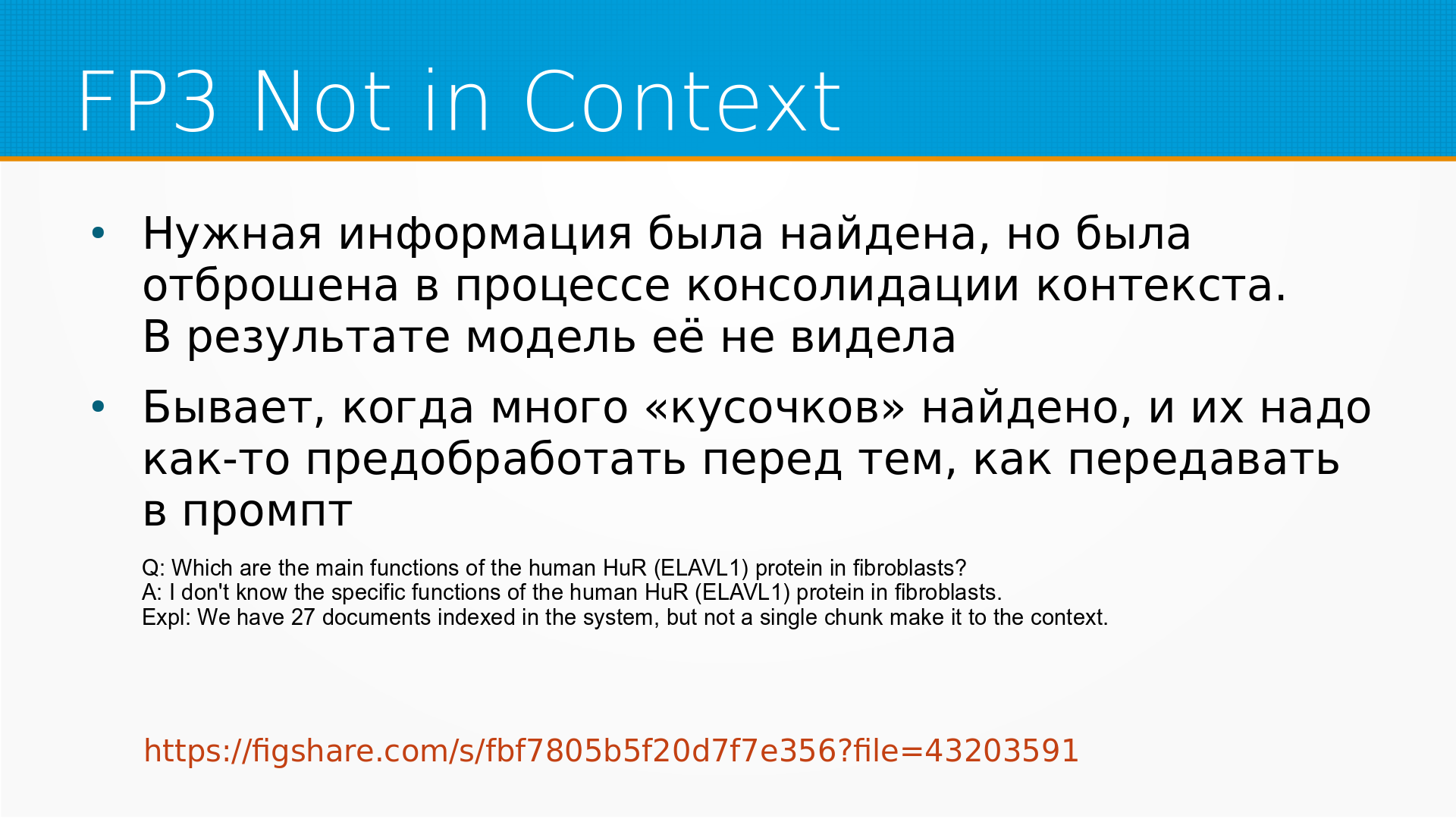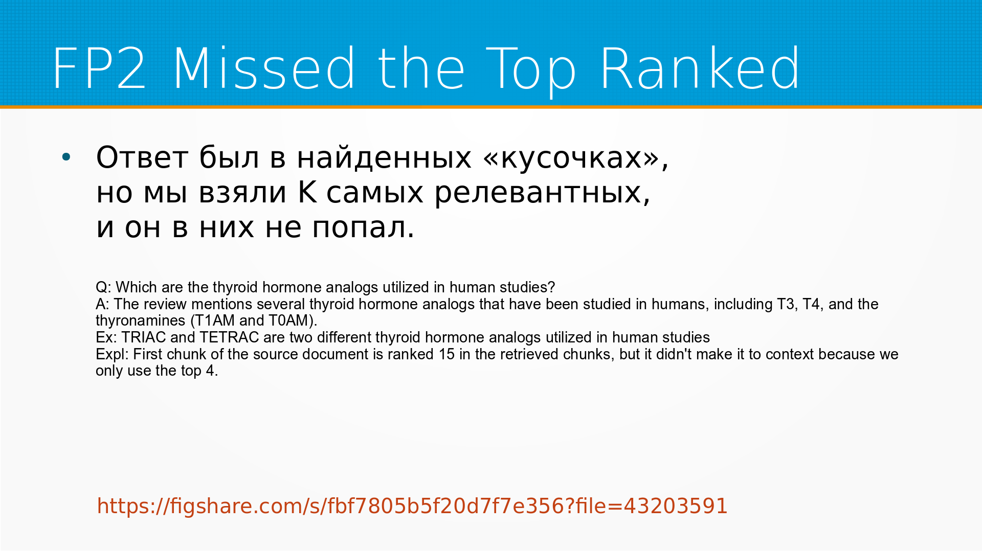 вторая точка отказа ожидаемая это объект был в базе данных. И он даже был в найденных кусочках, но поскольку мы не можем все найденные кусочки сложить в промп, мы берем некоторое количество самых релевантных, он в них не попал. И вот тут тоже пример, какие аналоги тироидных гормонов используются в исследованиях на людях. И, в общем, ответ очевидно неправильный. и объяснения, которые они предлагают, что нужная информация была, но документ был 15 по порядку, а они брали первые 4. И вот тут, если помните, мы говорили, что они не использовали рерайтер, и вот скорее всего из-за того, что они не использовали рерайтер, у них вот эта проблема ранжирования не была, потому что он ее хорошо лечит.