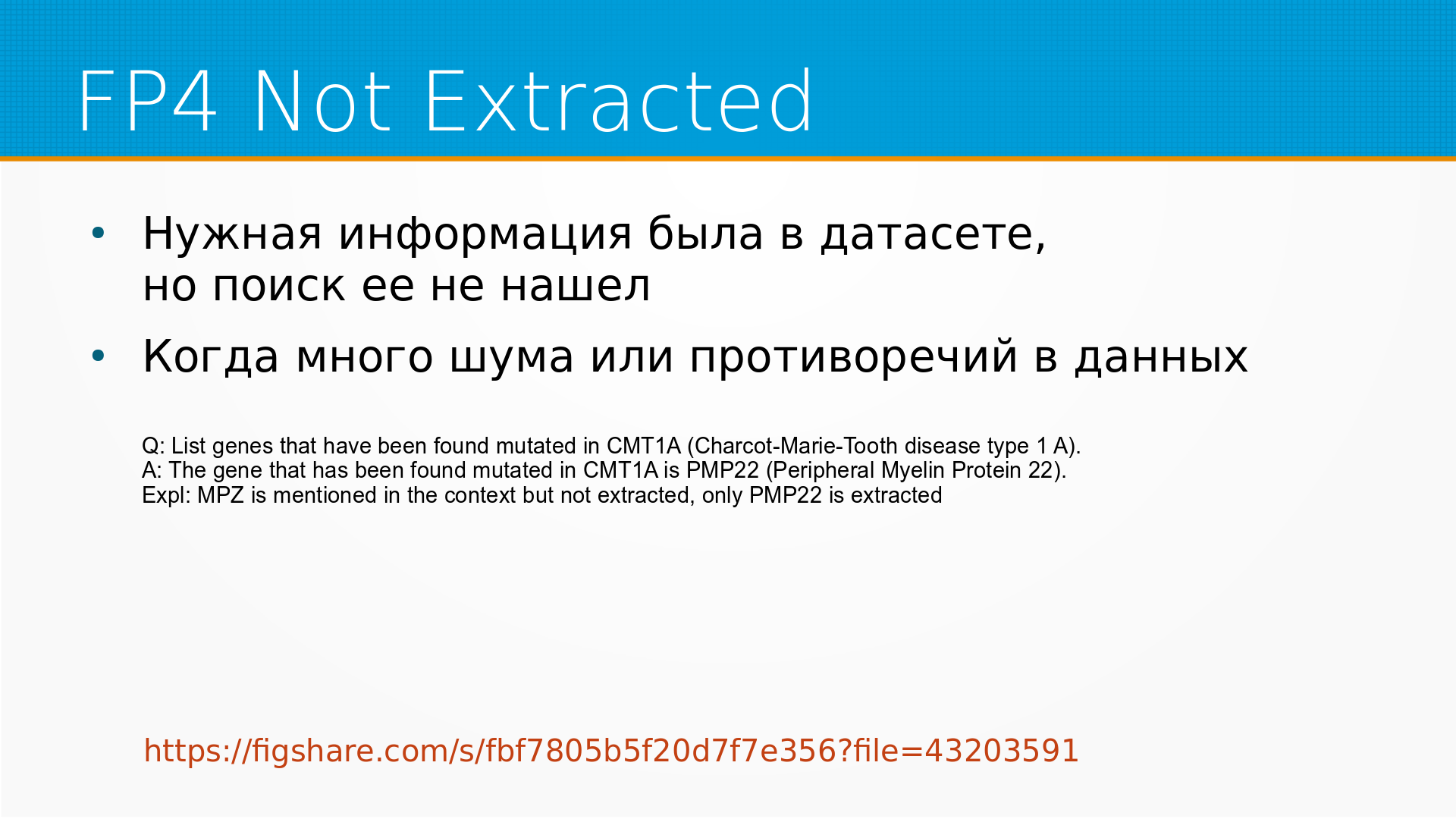Точка отказа это нужная информация была в дата-сети, но вопросно-ответная система не ответила на неё, то есть она не использовала её при ответе. Но когда в найденных кусочках много разных и противоречивых каких-то утверждений, а это легко может быть, потому что когда рак делают, его текст режут на кусочки довольно-таки бессмысленных, как попало, и в нём получается много шума и противоречий.