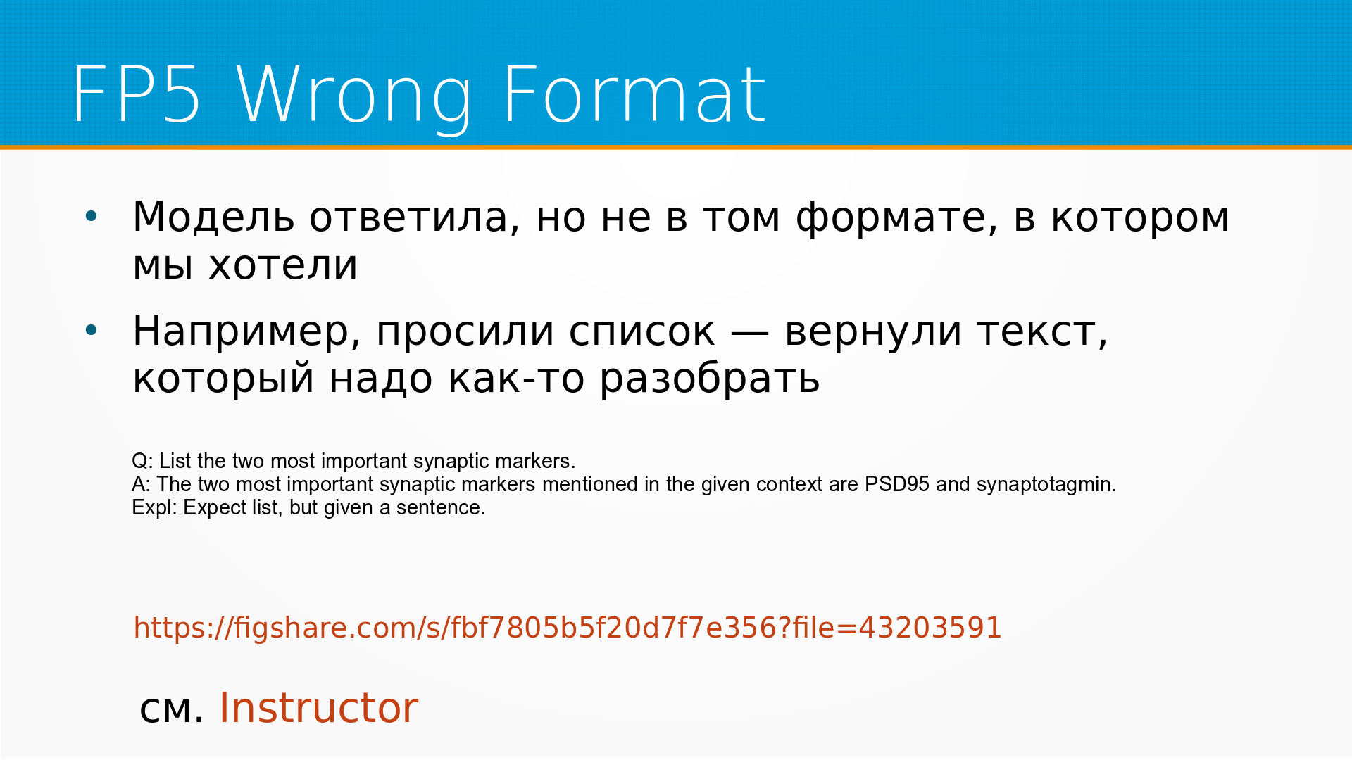 Пятая базовая точка отказа – это неверный формат, то есть модель ответит, куда шел предикт модели, то есть живой человек, это может быть и хорошо. А если мы хотели использовать модель дальше, где-то в цепочке, как это часто бывает, то вся остальная цепочка сломается. Ну вот, допустим, просили список или GSUM. То есть, в принципе, вот тут на примере ответ более-менее правильный, но он дан не в виде списка, а в виде предложения. И вот тут от меня дополнение. Есть такая интересная библиотека Instructor, которая позволяет писать pydantic-модели для ответа LLM. И в случае, если ответ не проходит через вот эту pydantic-модель, Но на его повтор на некоторое количество раз лент пинаются в надежде, что все-таки какой-то ответ из нее выпадет.