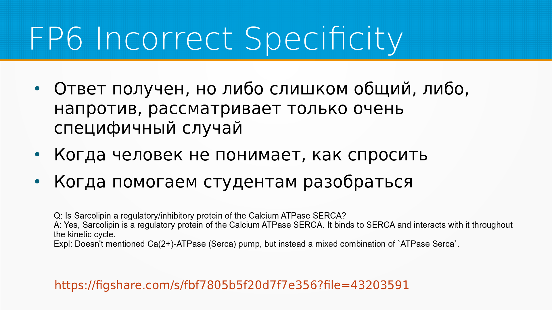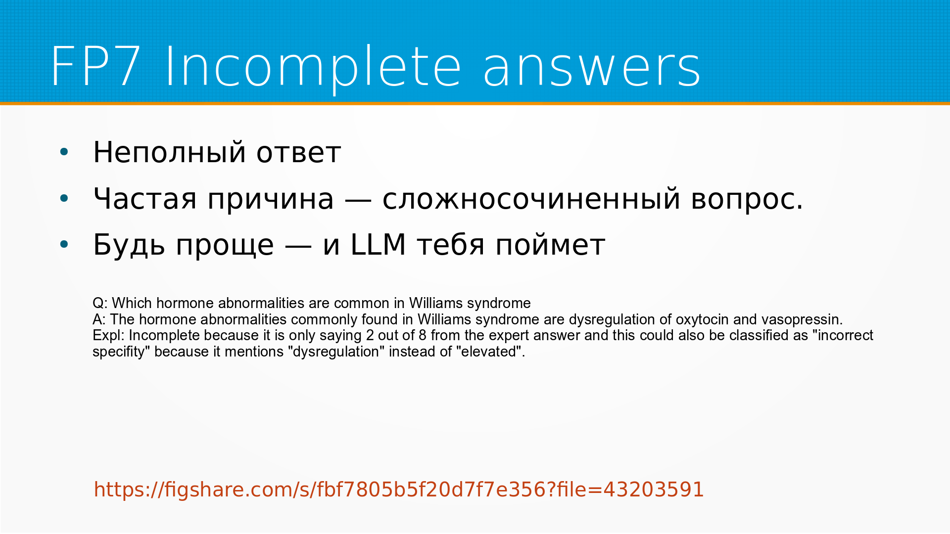 и неполный ответ это когда модель ответил на половину вопроса То есть, например, если мы модель спросим, любишь ли ты смородиновое варенье и бутерброды с хлебом. То есть мы задали ей фактически два вопроса и она на что-нибудь из них ответит. И вот тут пример такого сложного ошибочного вопроса. какие гормональные нарушения обычны при синдроме Уильямса. И вот она отвечает слишком обще, а ниже пример того, как люди хотели, чтобы она ответила. Там по ссылке прямо в Excel документы примеры вопросов, примеры проблем и так далее.