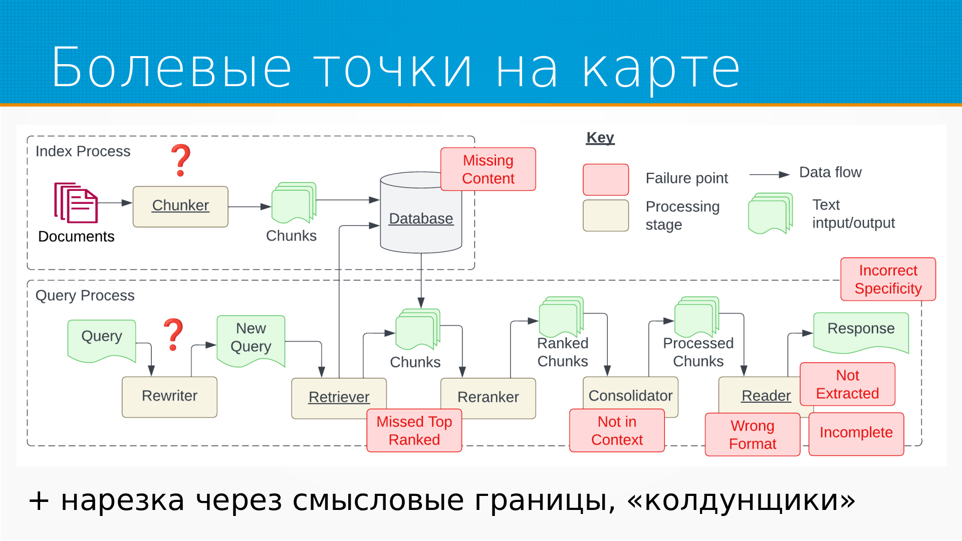 Если вернуться к вот этой карте Рега, то красными как раз прямоугольничками они отметили все вот эти болевые точки. Интересно, что они ничего не сказали о двух самых очевидных болевых точках, которые вот я вижу. Вот. То есть вообще такое в индустрии мнение, что самый большой враг рэк-систем это чанкер. То есть, когда мы берем наши документы и начинаем их резать на кусочки, чтобы потом их искать и подкладывать в промпт, мы можем, во-первых, некорректно резать их. То есть, мы можем, например, резать их по границам предложения, по точкам. Не дай бог, у нас там точка в середине текста, число какое-нибудь или специальное обозначение будет. Мы можем резать их, например, по длине какими-то правилами и легко разрезать предложение по смыслу посередине или абзац посередине. Мы, в общем, можем полагаться на то, что человек разумно отформатировал абзацы, но и тут мы бываем неправы. Самый, пожалуй, продвинутый способ делать чанкеры – это когда специальная языковая модель Вот, она конкретно делает чанки. То есть, когда у нас чанки не регулярками, не какими-то правилами, а другой языковой моделью. Но это достаточно дорого и медленно. Вот. И второй вопрос, к которому они совсем не коснулись, это рерайтер. то есть нам приходит вопрос вот допустим если помните лет например 10 назад яндекс такую штуку придумал колдунчик вы ищите билет в берлин например а он авиаперелет в германию и вот такие вещи расширял ваш запрос А в REC-системах это сейчас вполне хорошо работает. И для рерайтинга используются тоже языковые модели, причем есть такая, например, интересная техника, гипотетического ответа, когда мы берем вопрос и говорим языковая модель, а сочини примерный ответ на этот вопрос, каким бы он был. Она сочиняет и затем мы начинаем искать чанки похожие не на вопрос, а на ответ, что вообще-то говоря логичнее, потому что ответы вопрос могут в разных доменах лежать да вот и вот нарезка через смысловые границы колдунчики они почему-то пропустили такие