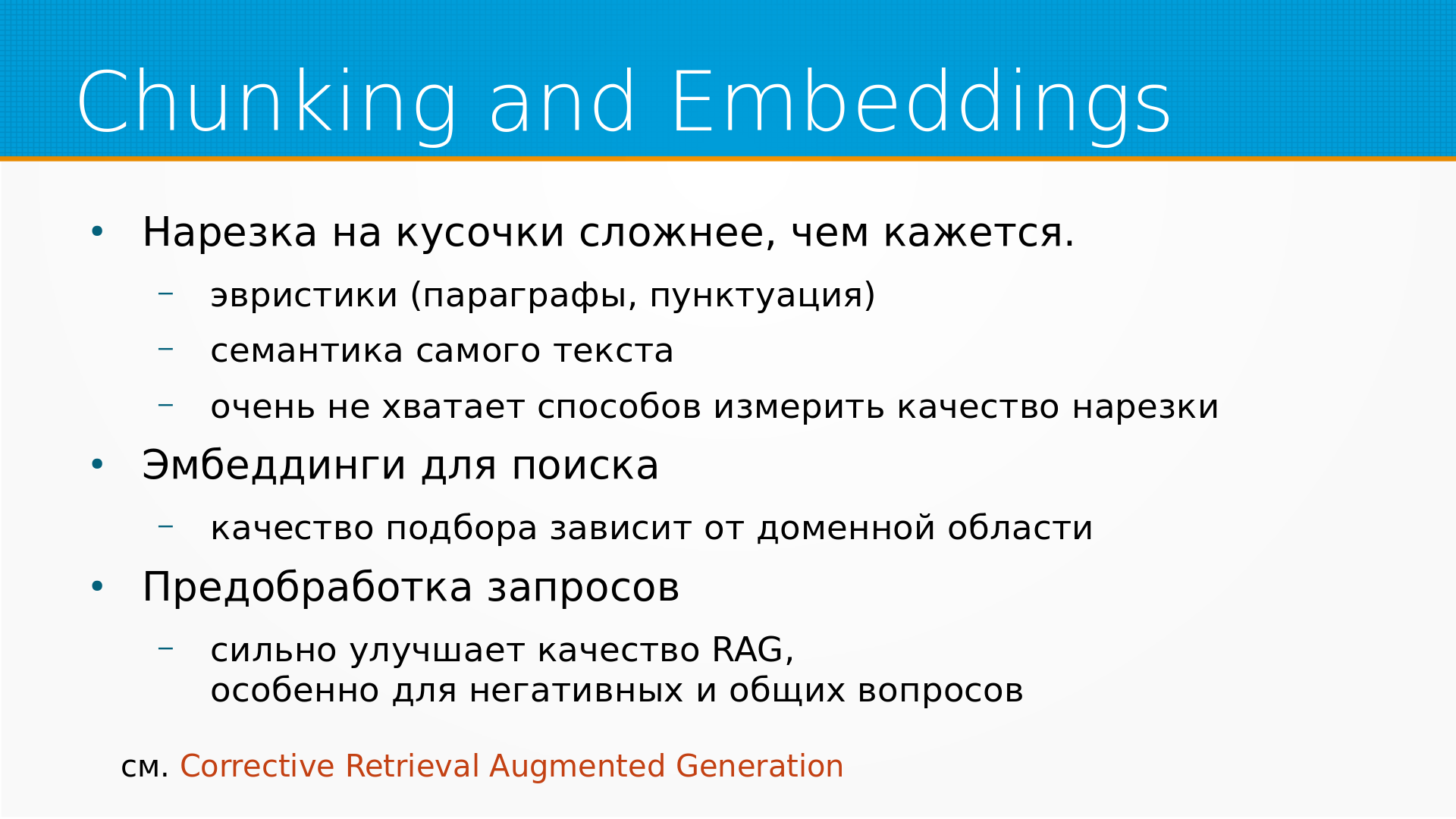 Какие они предлагают направления развития? Но почанки на имбединг, они обращают внимание, что нарезка на кусочки гораздо сложнее, чем кажется. Как я уже говорил, часто используют разного рода эвристики. продвинутые способы нарезки используют семантику самого текста языковые модели и каких-то бенчмарков, которые позволили бы сравнивать качество нарезки, не качество имбеддингов для рынка, а именно качество нарезки. Я, например, не знаю. И мне вот их тоже остро не хватает, потому что в том, например, реге, об которой мы сейчас головой бьемся, там сам по себе этап ретривела, этап нарезки, ну вот он Непонятно, как его накручивать, не измерив. По поводу эмбеддингов для поиска. Есть, в принципе, такой общепринятый рейтинг эмбеддингов для русского языка, но вообще-то качество подбора зависит от доменной области. То есть одни эмбеддинги хорошо работают в одной доменной области, а какие-то в другой. сильно улучшает качество RAG и особенно это для негативных общих вопросов. Тут я добавил ссылку на статью, которую авторы не видели, потому что она вышла 29 января, по-моему. Corrective Retrieval Augmented Generation это как раз интересная техника, которая позволяет предобработать отобранные куски до того, как мы их передадим на другие этапы с помощью языковой модели. То есть, грубо говоря, мы языковую модель спрашиваем, как ты думаешь, а будет ли этот кусок полезен?
