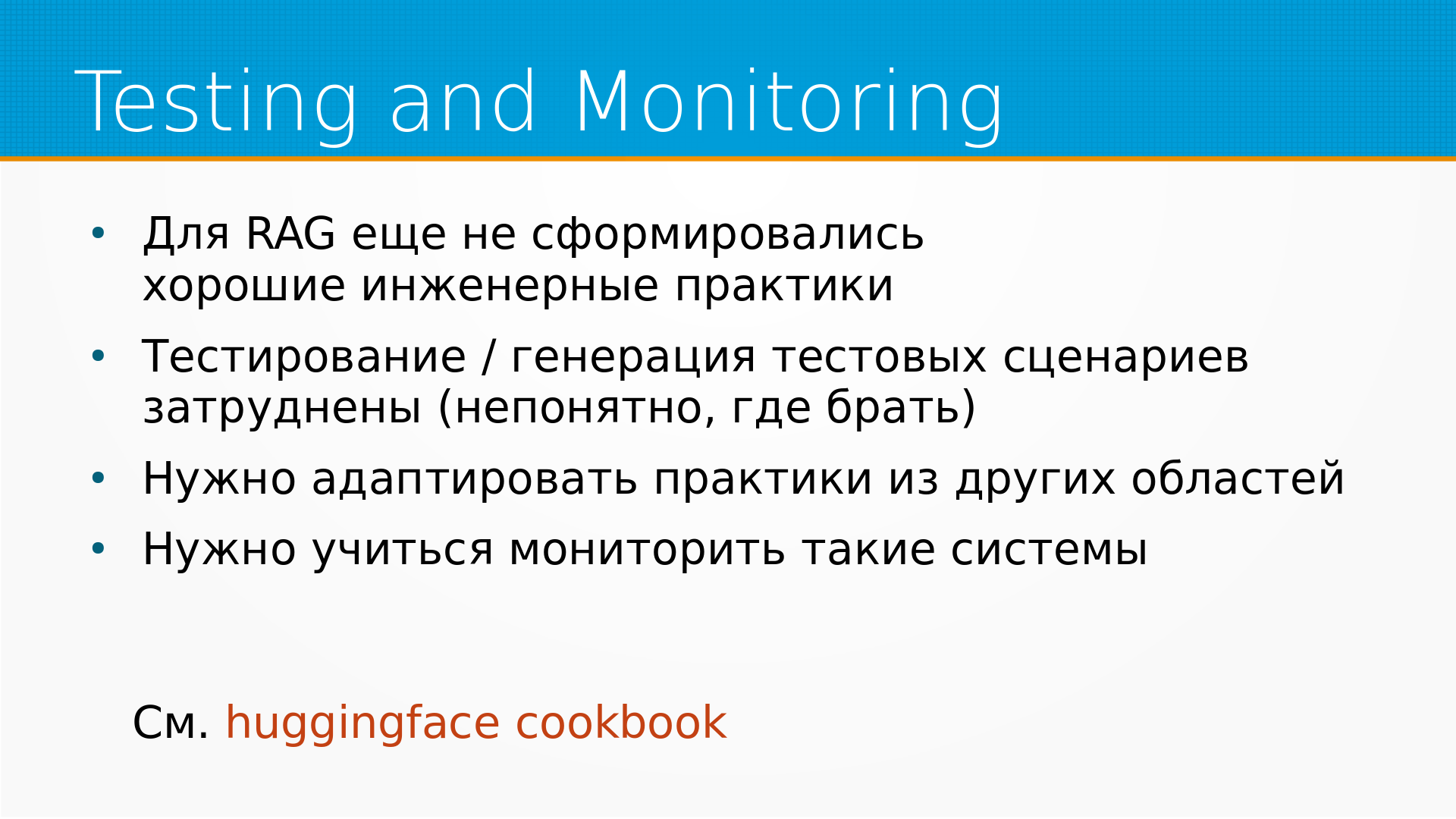 Ну и про тестирование. Для RAG нет хороших инженерных практик, Это как раз статья, это попытка их возвести. С тестированием и генерацией тестовых сценариев трудно. В общем, не очень понятно, как их тестировать, как составлять тестовые случаи. И процесс адаптации практики с других областей только идет. И как мониторить такие системы тоже непонятно. Хаггинфейс тут недавно выкатили репозиторий с кук-буками. И я от себя добавил ссылку. Может быть там, мне кажется, полезные замечания от Хаггинфейса.