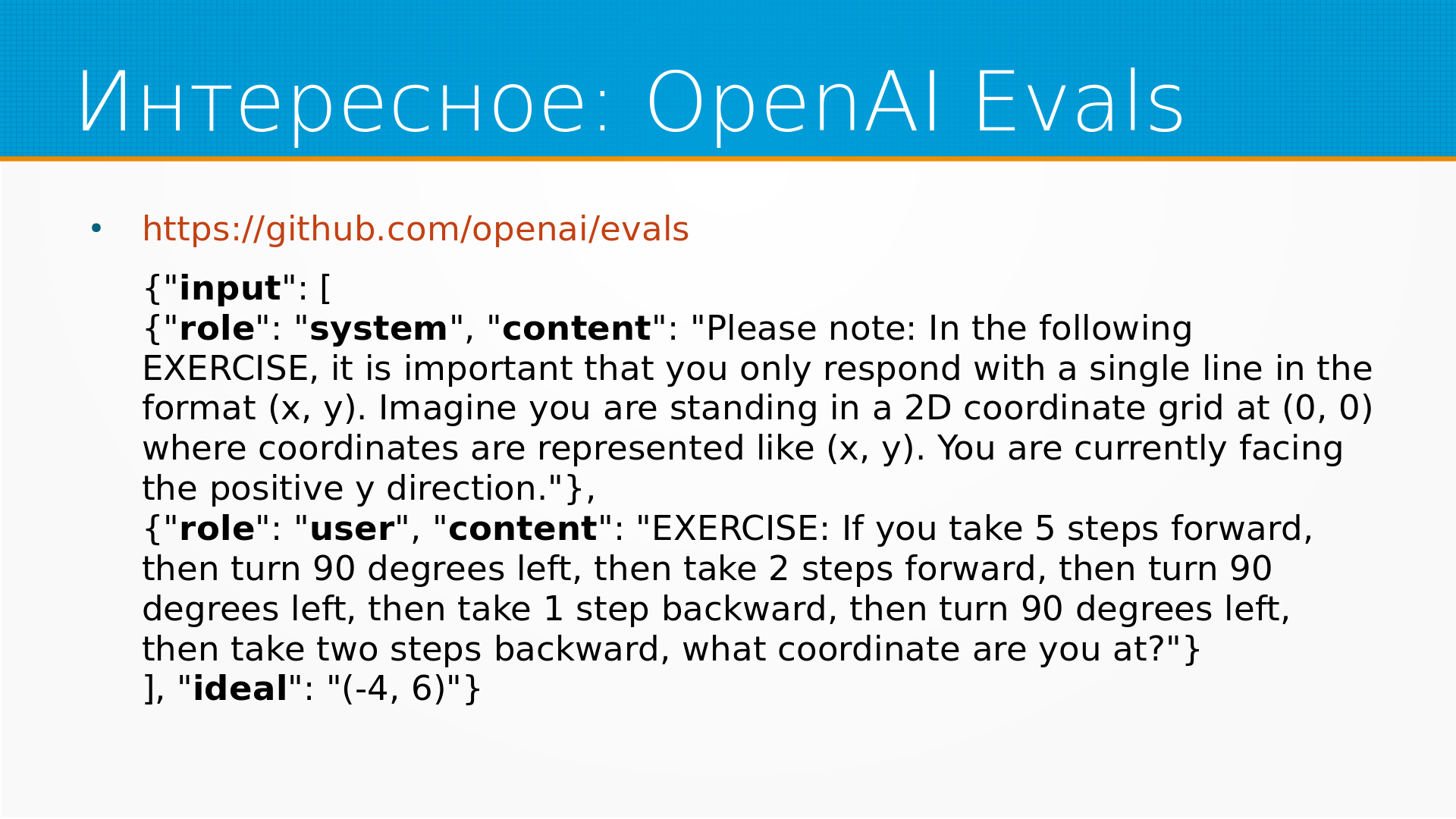 Из интересных мелочей, на которые я наткнулся, пока читал список литературы. Во-первых, это OpenAI Evals. Он почему-то прошел мимо меня, а OpenAI есть, оказывается, целый фреймворк для оценки качества работы языковой модели. То есть вы пишете вот такие тесты, что сделай так, от тебя ожидаются вот такие ответы, и можно гонять и сравнивать на своем домене.