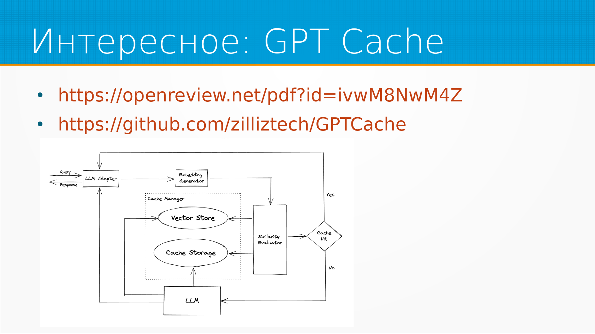 Ну, про GPT-Cache я рассказывал, это семантический кэш. Там есть статья у них на OpenReview и есть библиотечка, и в Lama Index они уже интегрированы. То есть там все достаточно прозрачно устроено, у нас есть некоторые генераторы эмбеддингов, и он эмбедит наши запросы, смотрит, не делали ли мы похожие запросы, если делали, то отвечает из кэша, если не делали, то запрашивает или ленку складывает с кэшем, то есть вот такая система.