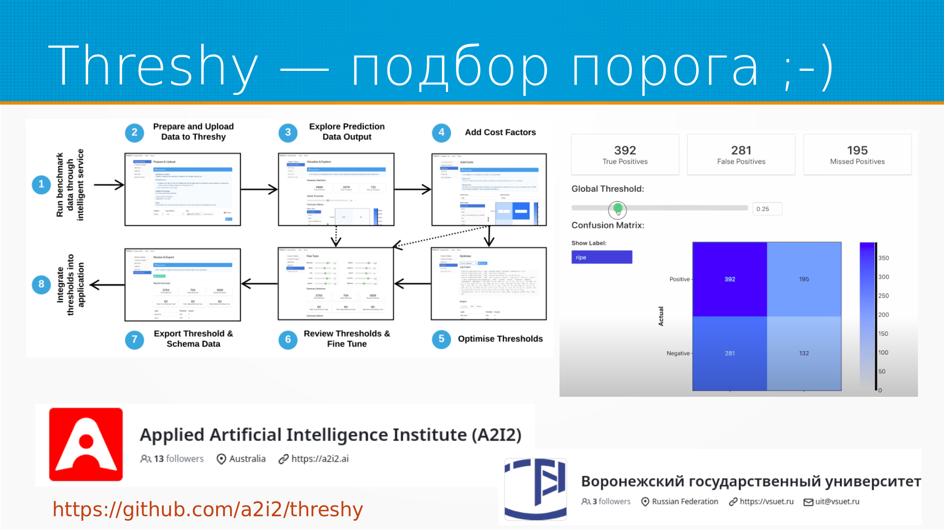 Ну и из забавного у них там в списке статей, но обязательно нужно себя процитировать, у них есть такая трэши. это библиотека для подбора порога в классификаторах. Вот. Она, с одной стороны, как бы такая смешная, то есть вы интегрируете в свой код их веб-приложений, оно отправляет туда свои решения, а вы подкручиваете порог принятия решений и следите за Confusion Matrix. То есть, по идее, если вы какой-нибудь Evidently AI используете, то вы это все и так видите. Но надо понимать, что, во-первых, они сделали это пять лет назад и выложили в открытый доступ. То есть они пять лет назад уже об этом задумывались. А во-вторых, это фактически говорит, что они инженеры неплохие, они пытаются дотаскивать пороги до конечных пользователей своих систем. что делает системы более гибкими. Я об этом когда-нибудь расскажу. Ну и относительно сравнения с Воронежским государственным университетом. У него три фолловера на гитхкабе, а у них 13. Вот. Ну, наверное, на этом все у меня.